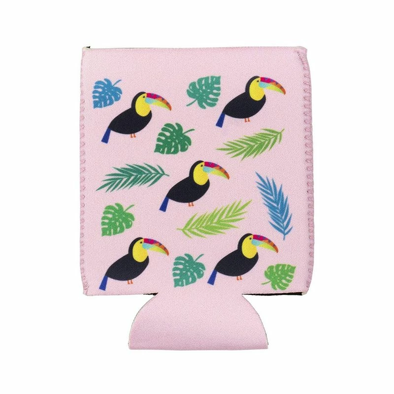 - BEER CAN SLEEVE: Set of 12 covers includes 4 designs with 3 each. Designs include flamingo, tropical fruits, ice cream, and toucan.