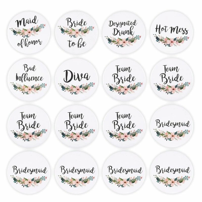 - SET INCLUDES: 5 “Bridesmaid” pins, 5 “Team Bride” pins, 1 “Hot Mess” pin, 1 “Designated Drunk” pin, 1 “Maid of Honor” pin, 1 “Bad Influence” pin, 1 “Bride to Be” pin, and 1 “Diva” button pin.
