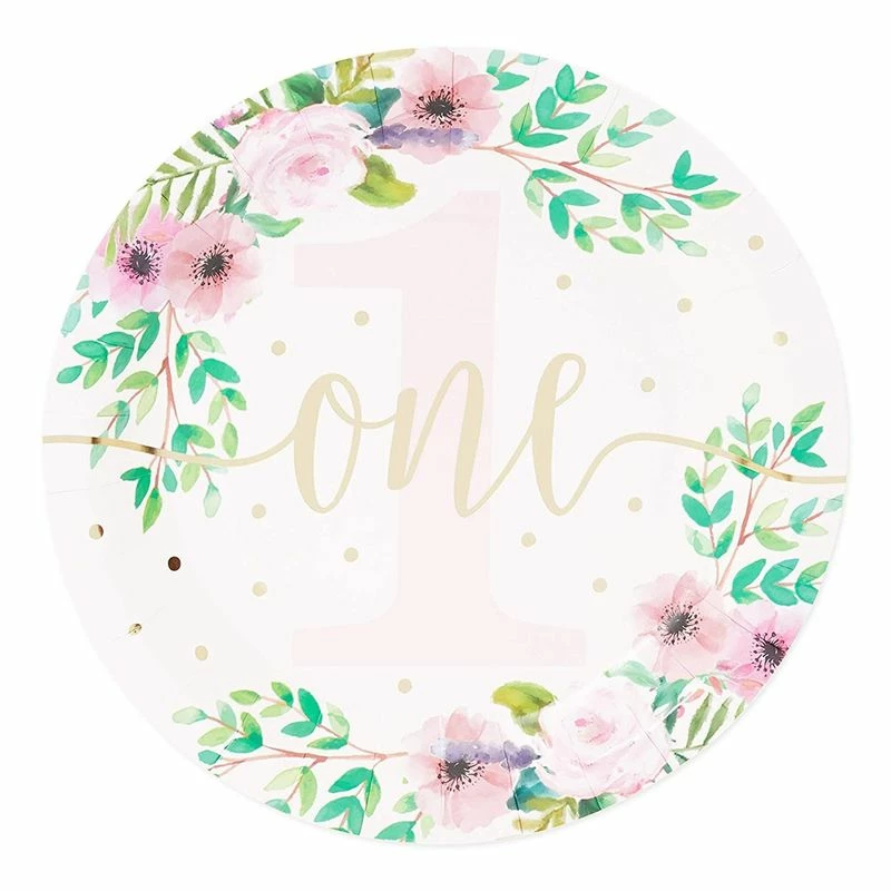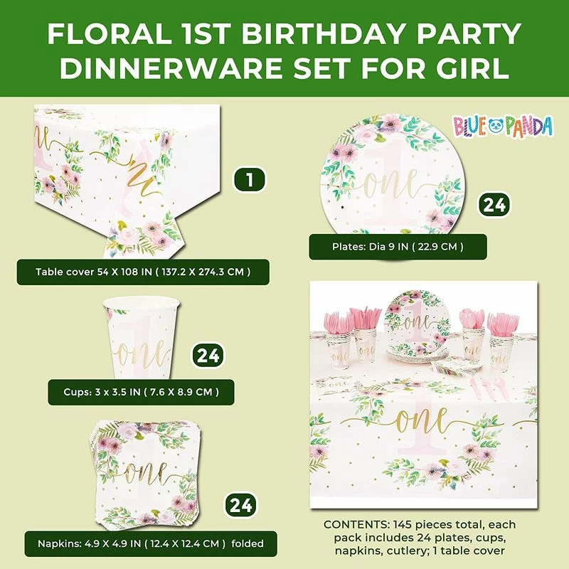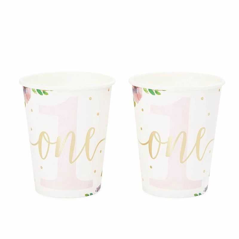 - 1ST BIRTHDAY PARTY DECORATIONS: Tableware set, napkins, and paper cups feature pastel pink flowers and gold accents; ideal for creating a celebratory atmosphere for your baby girls first birthday party