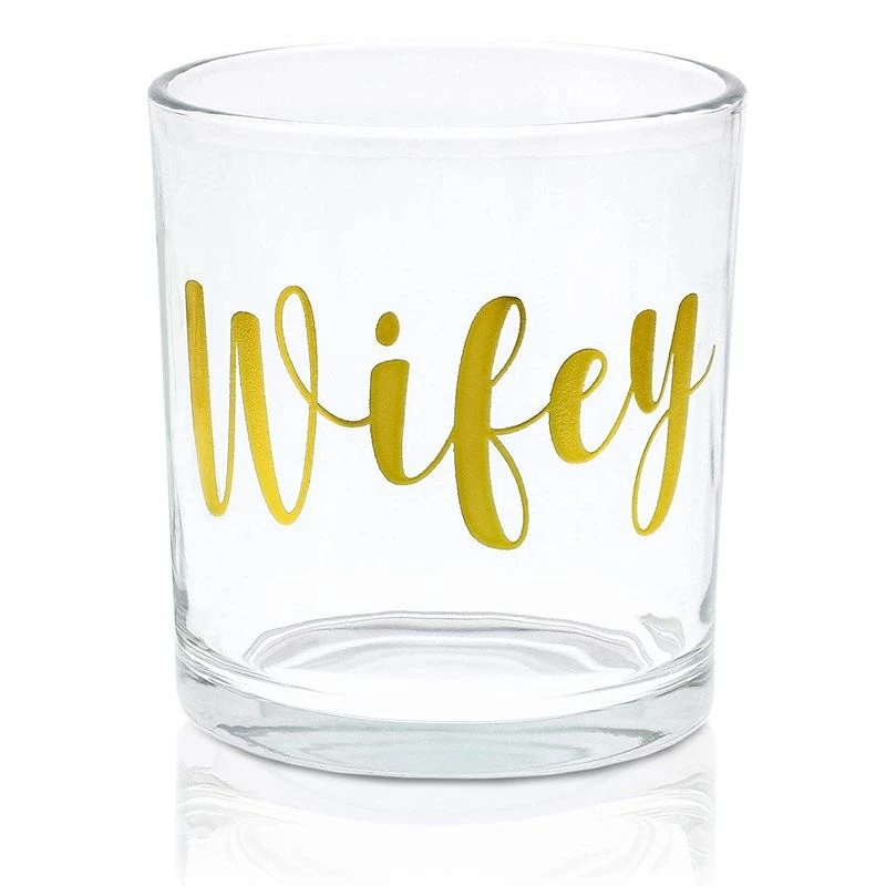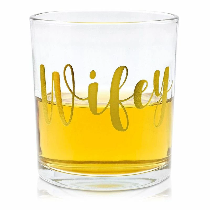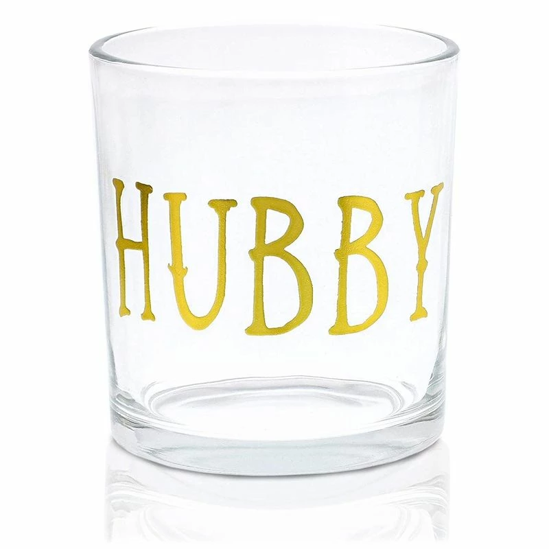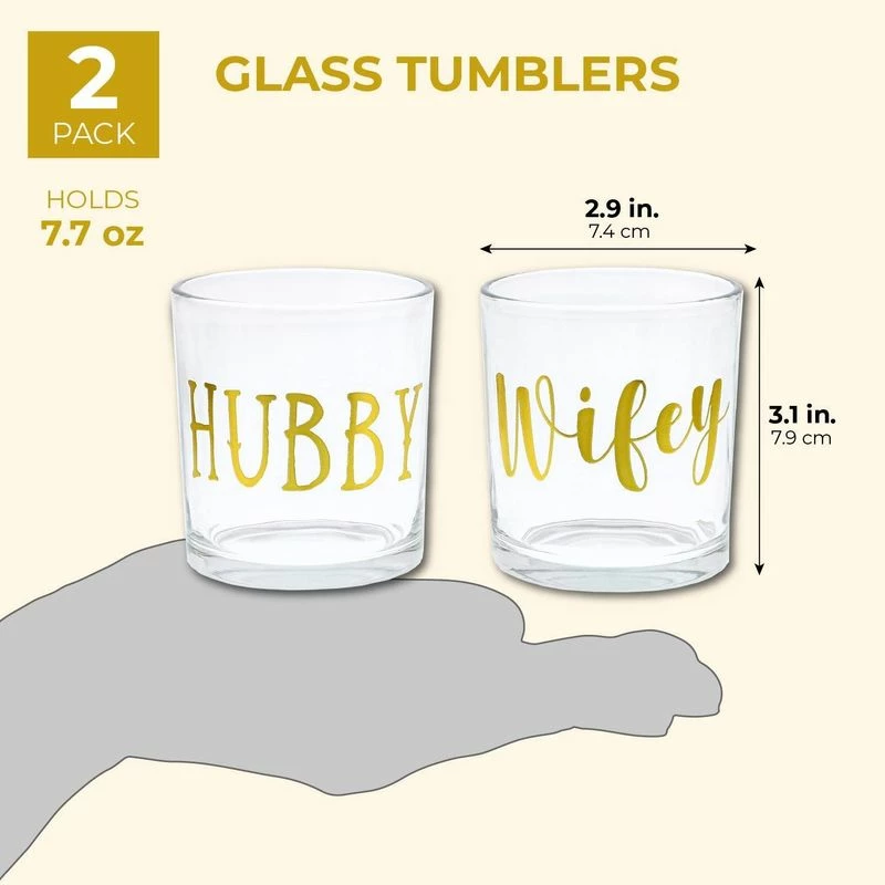 Hubby and Wifey glass tumblers with gold foil etching. Perfect for wedding toasting, bridal shower, anniversary and gifts for couples. Made of thick quality glass for long lasting use. Holds about 7.7 ounces, 2.9 inches Diameter x 3.1 inches height