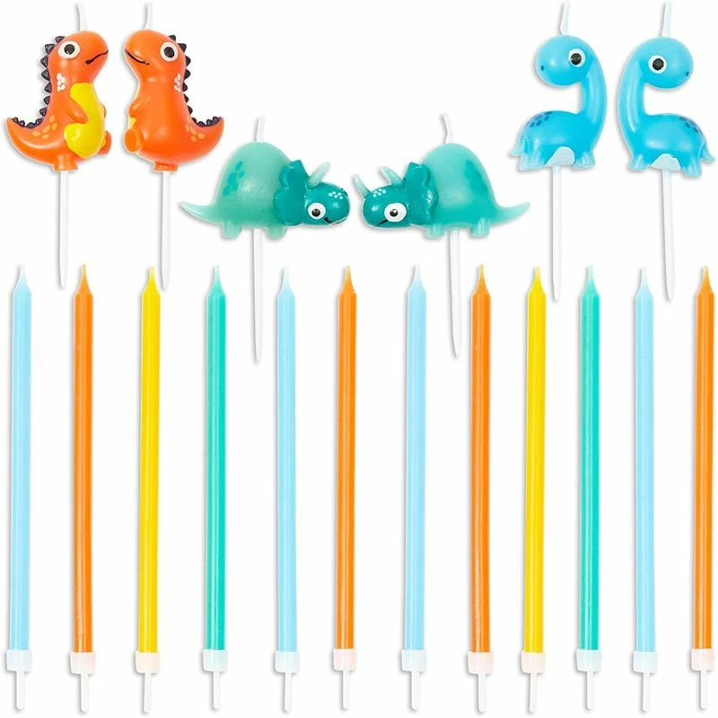 - WHAT’S INCLUDED: Set Includes 6 dinosaur cake topper; 12 thin candles in 4 colors: red, yellow, orange, and green; 18 pieces total