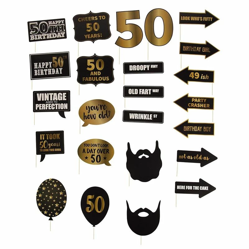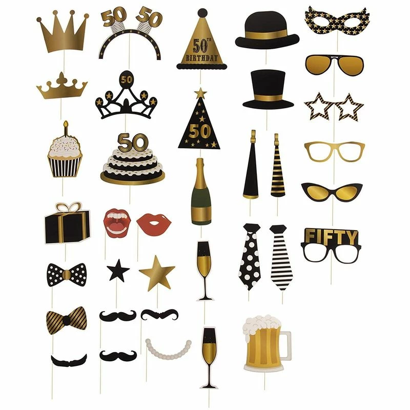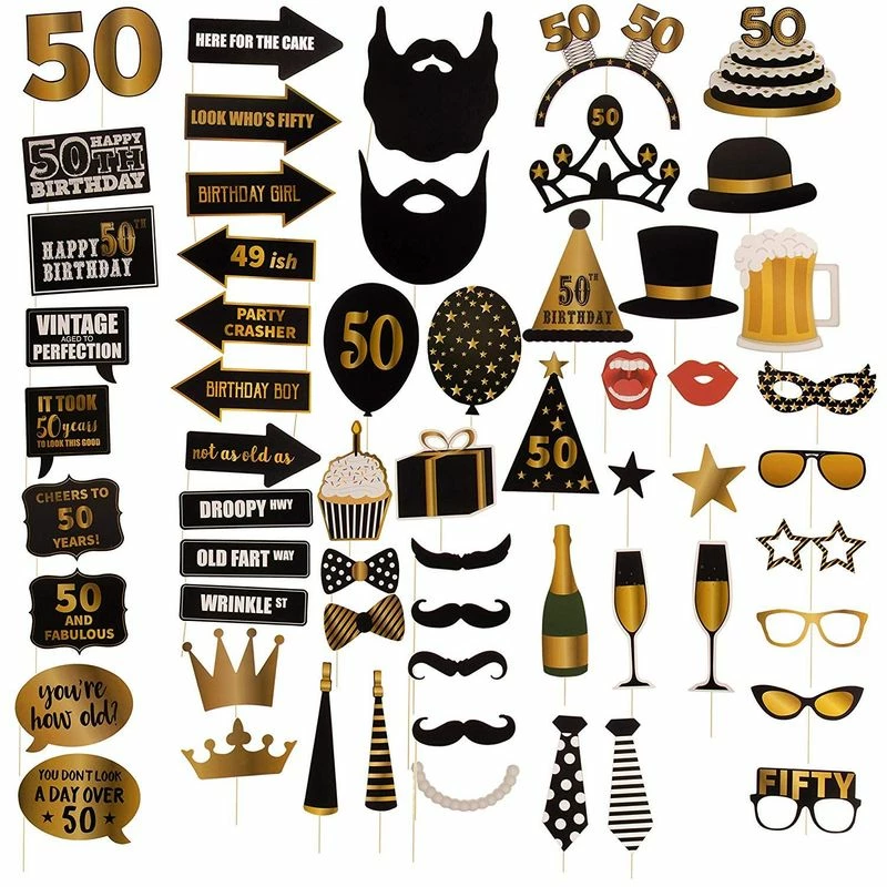 - BIRTHDAY PHOTO BOOTH PROPS: This set contains 60 50th birthday themed party photo booth props, including balloons, party hats, birthday cake, champagne, gifts, speech bubbles, and many more!