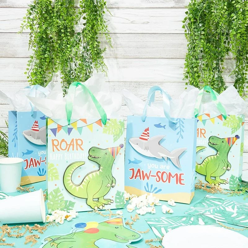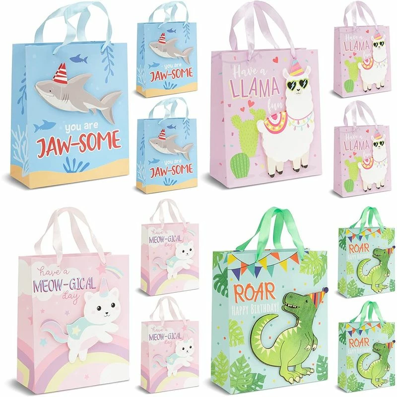- WHAT’S INCLUDED: Includes 12 gift bags in 4 designs that include a unicorn kitty, dinosaur, llama and shark