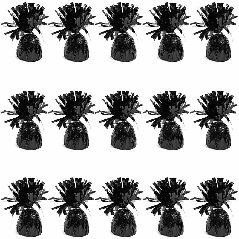 - BALLOON WEIGHTS: Each balloon weight is wrapped in a decorative, metallic black mylar with tinsel-like fringes on the top