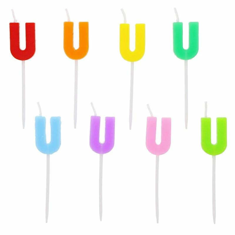 Includes 2 boxes of letter U candles (48 Pieces) and 2 boxes of short candles (48 Pieces) with holders (96 Pieces total). U Candles include 8 colors: Red, orange, yellow, green, lime green, pink, purple and blue. Striped short candles include 6 colors: red, yellow, green, blue, purple, and pink. Ideal for decorating Birthday party cakes, muffins, pastries, and other desserts. Dimensions: Letter U: 1 x 0.7 inches, Total length: 2.65 inches, Short candles: 2.45 inches, Holder: 0.75 inches