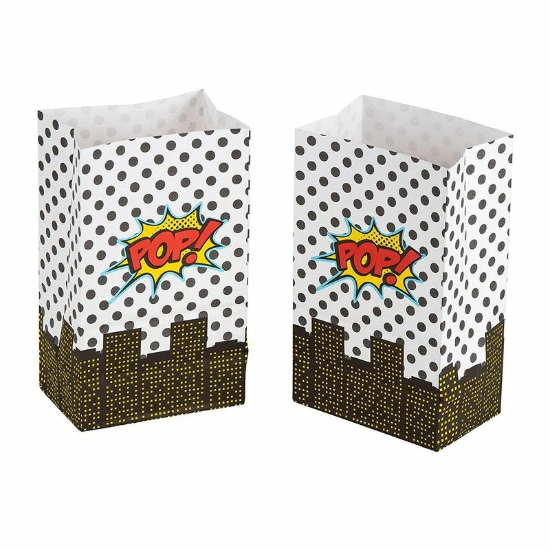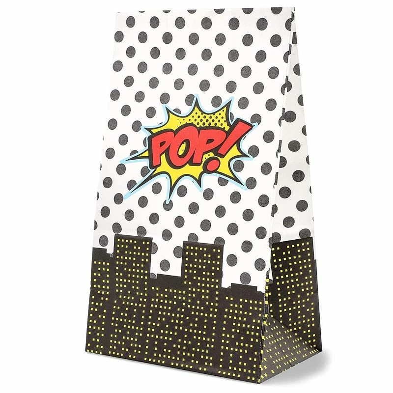 - BIRTHDAY PARTY TREAT BAGS: Includes 36 pieces of paper-made goodie bags featuring POP! In comic font on black and white polka dots bag. Perfect for giving out party favors and small gifts.