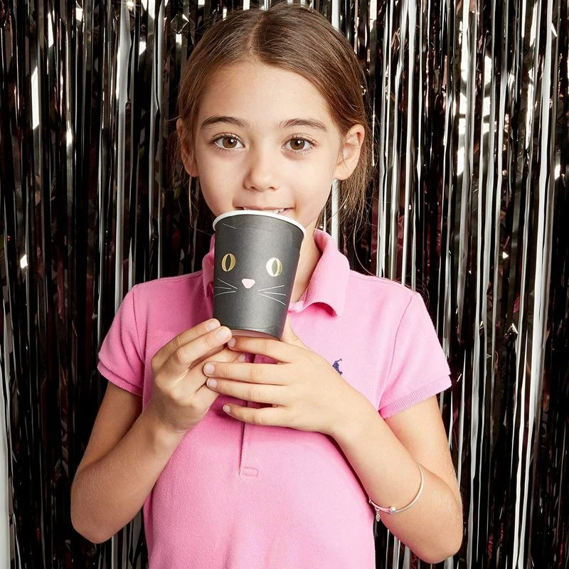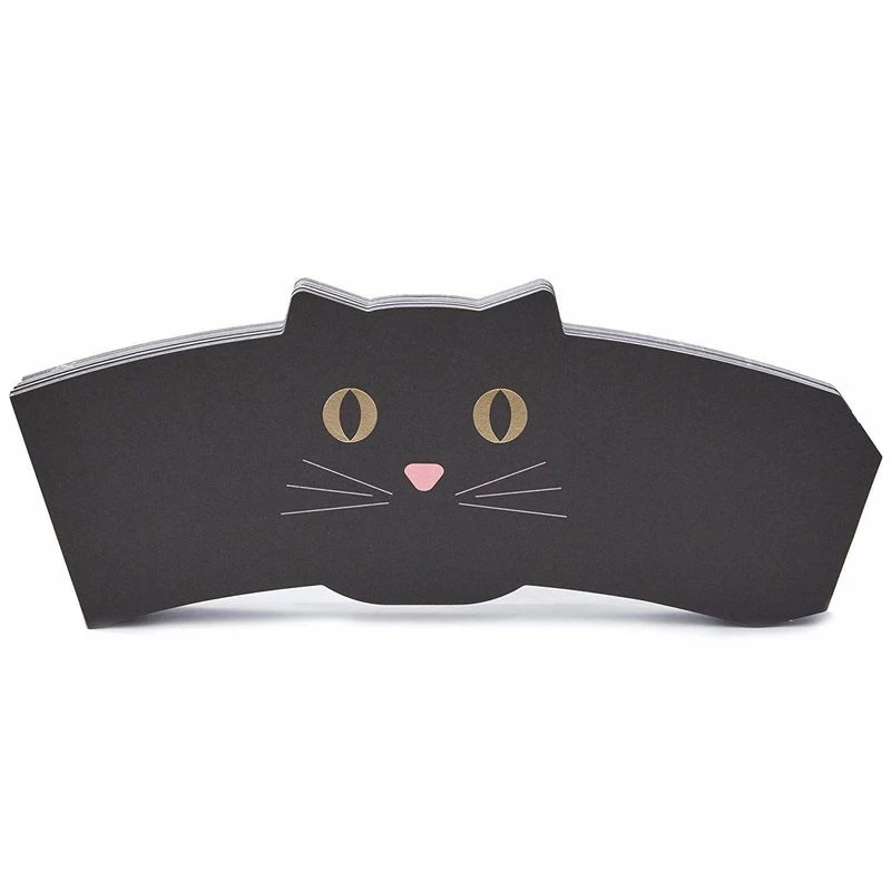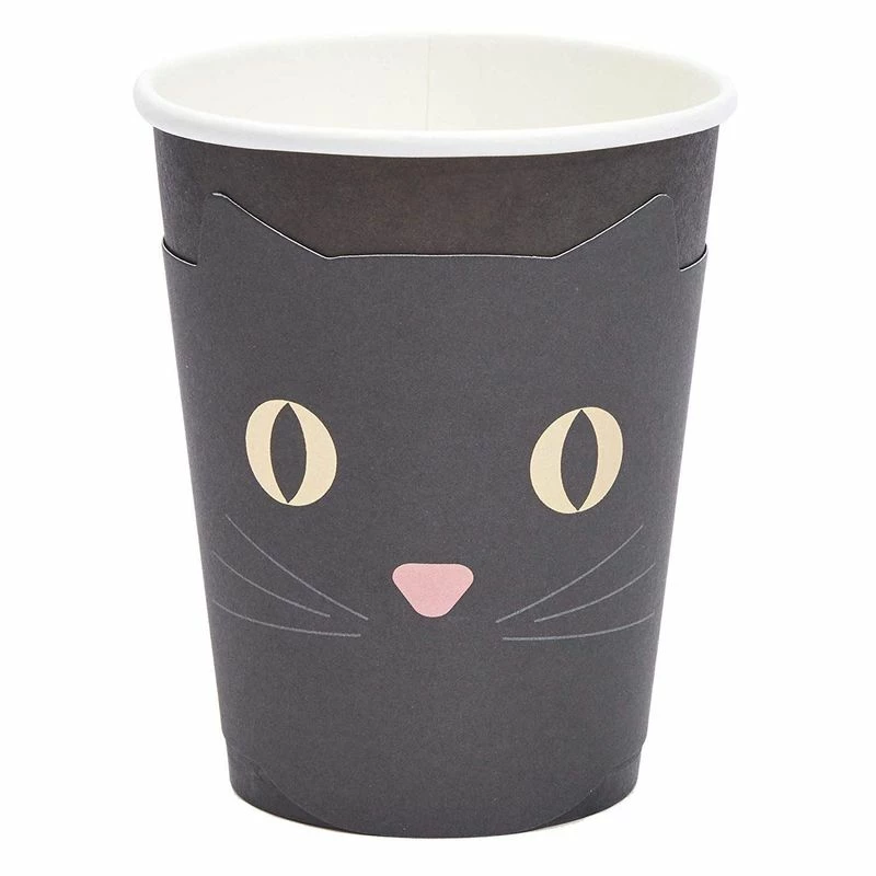 - Black Cat Party Supplies: Halloween party supply kit features black cups and matching die-cut cat sleeves with gold foil accents