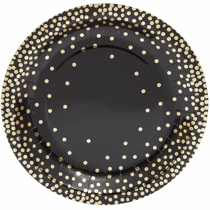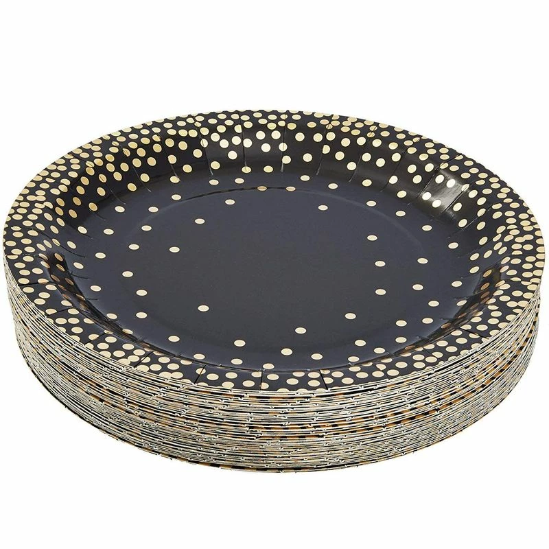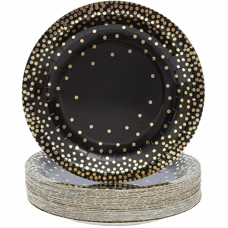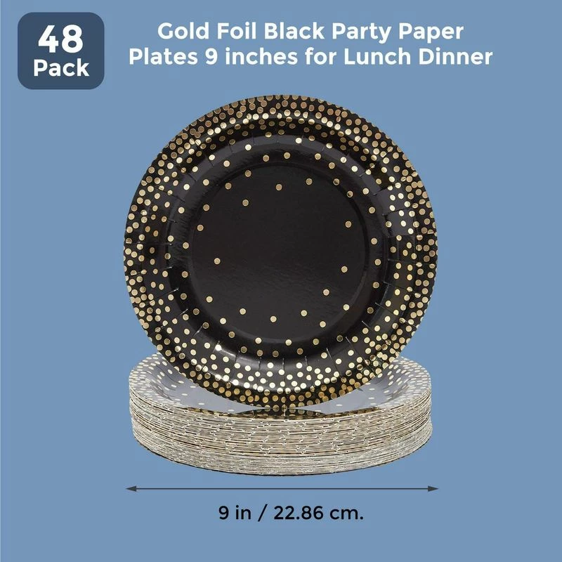 - SERVES 48: Includes 48 black paper plates with gold foil embellishments