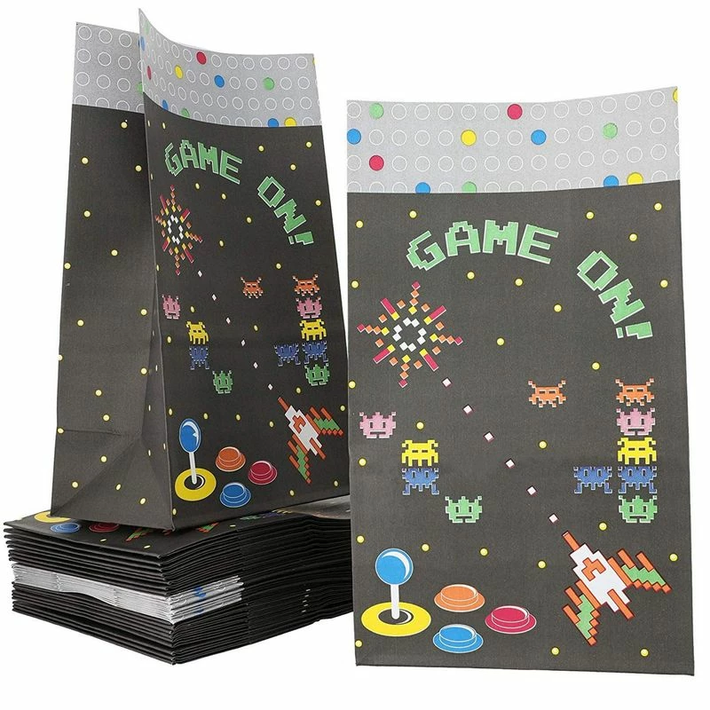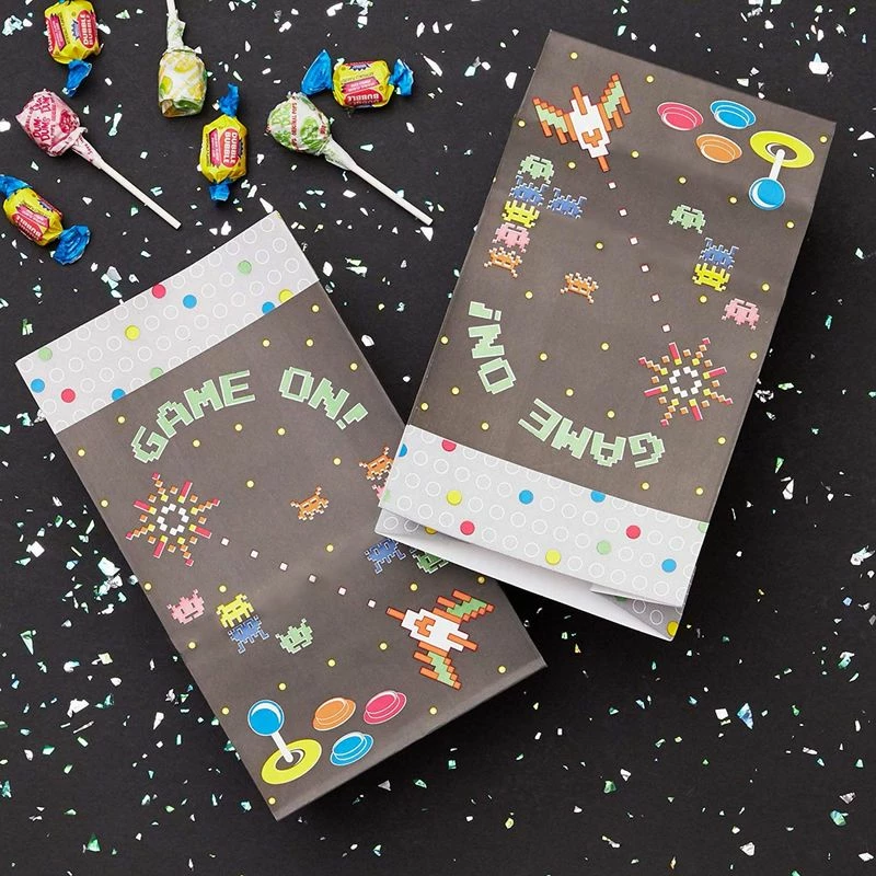 - Arcade Party Supplies: This pack includes 36 goodie bags with a black video game design
