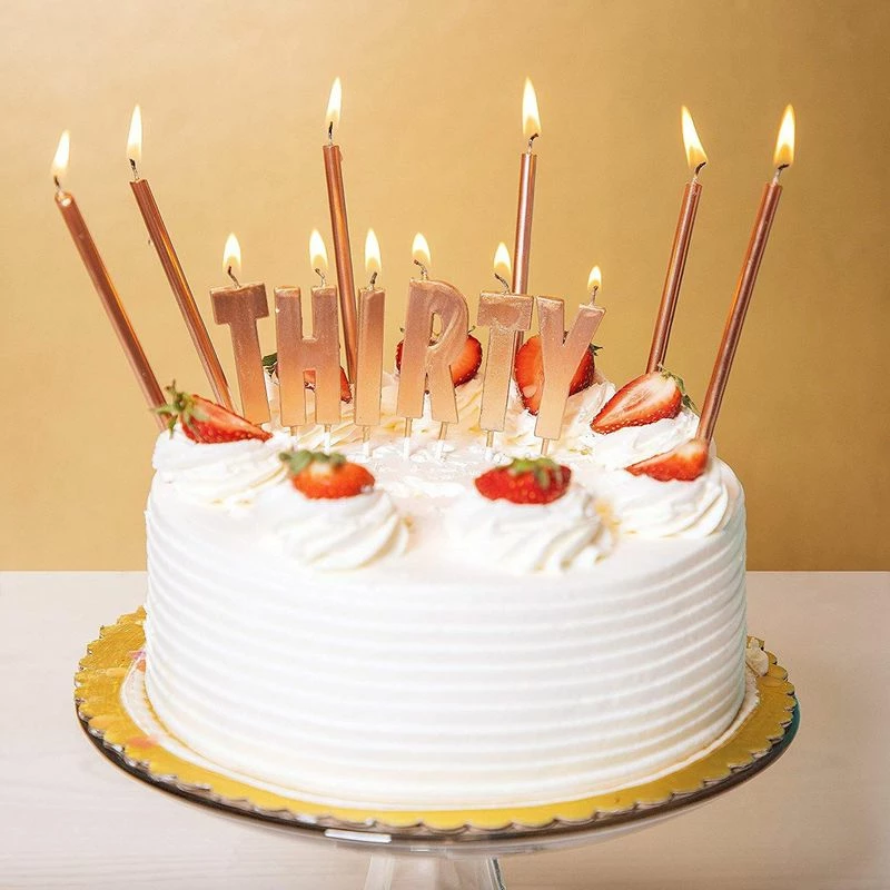 - Birthday Cake Topper Rose Gold: This set features “THIRTY” letter candles and 24 thin rose gold metallic candles; the detachable holder ensures stability in any cake, cupcake or dessert