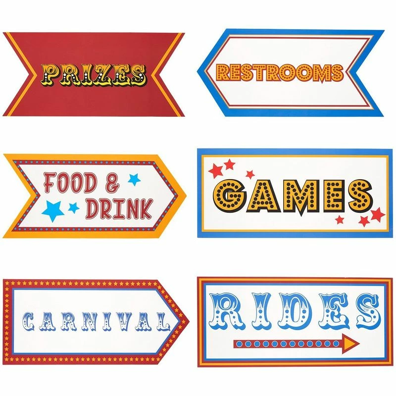 - CARNIVAL SIGN CUTOUTS: Contains 6 directional signs include Prizes, Restrooms, Food & Drink, Games, Carnival, and Rides in bold multicolor.