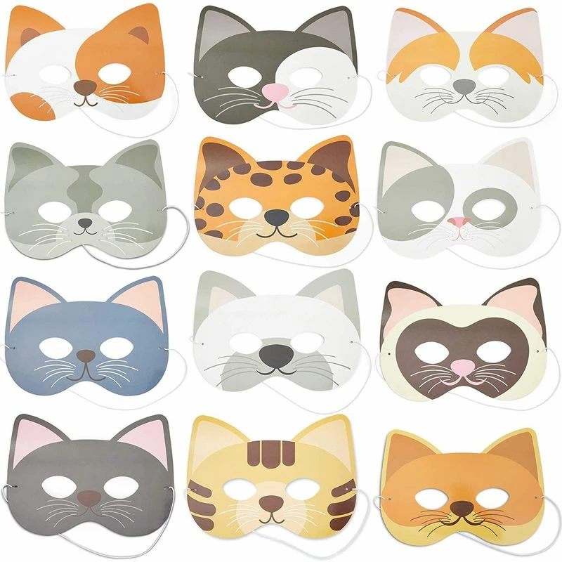 The set comes with 24 masks with 12 designs(2 of each) Perfect for kitty theme Dress-Up Cosplay party, birthday and other celebration events. The masks are printed on 300gsm cardstock making sure that they can endure through the whole celebration. Easy to use, fits all sizes. Great accessory for photo booths at celebrations, use them as photo props or fill goodie bags for your guests. Dimensions: 7.5 x 5.5 inches, 13 inches each string