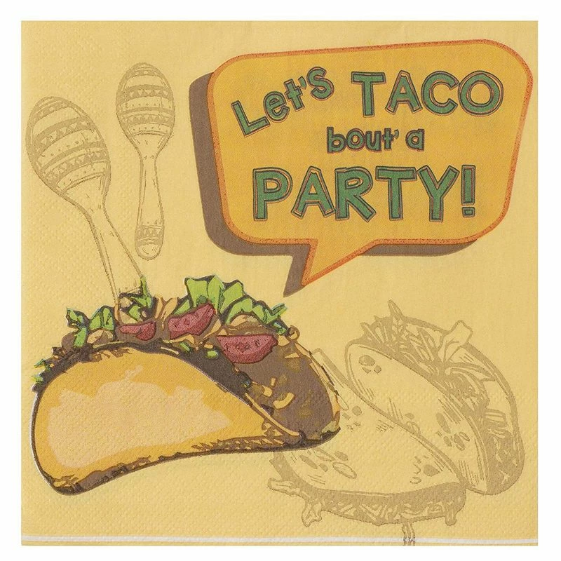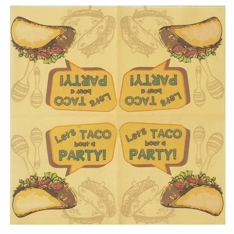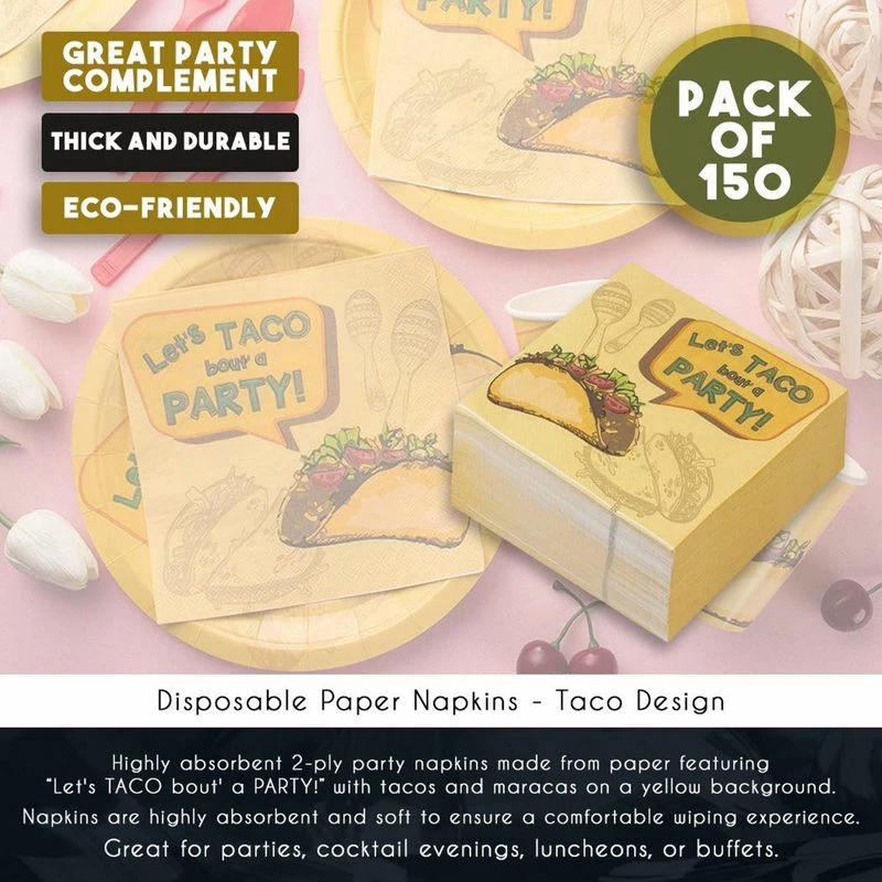 - SET INCLUDES: 150 highly absorbent 2-ply party napkins made from paper featuring Let’s TACO bout’a PARTY! with tacos and maracas on a yellow background.