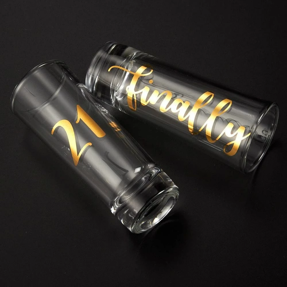 - 21st Birthday Shot Glass: Celebrate your 21st birthday with these fun and festive shot glasses that read “Finally 21” on the cups