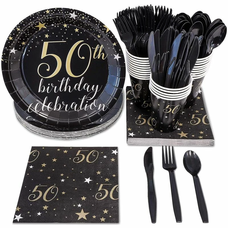 50th Birthday Party Supplies Serves 24 Includes Plastic Knives, Spoons, Forks, Paper Plates, Napkins Cups