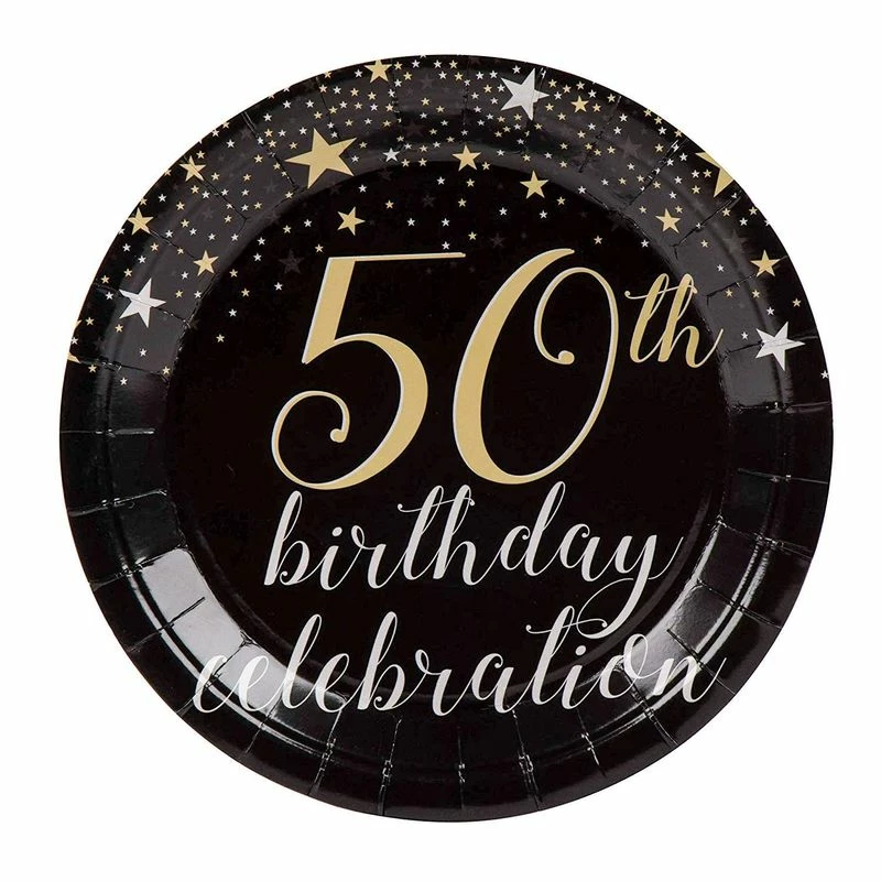 - MILE STONE BIRTHDAY SUPPLIES: Paper plates feature an elegant design with gold scripted 40th Birthday Celebration over a black background with stunning stars; create a perfectly coordinated theme for 50th birthday celebrations and founding anniversaries