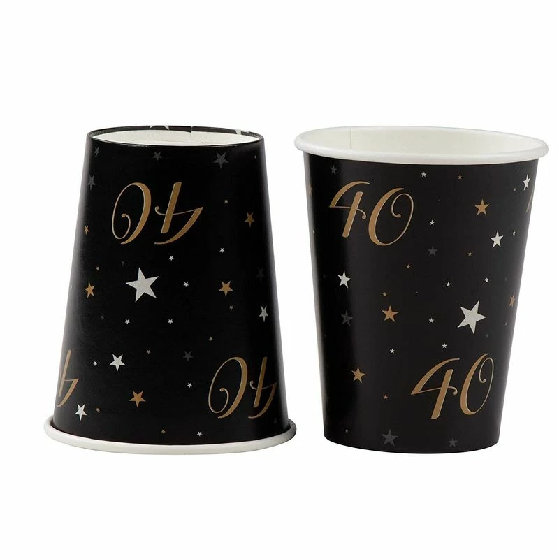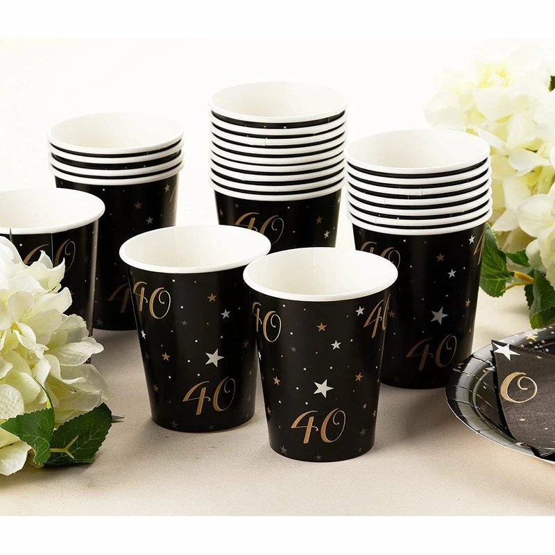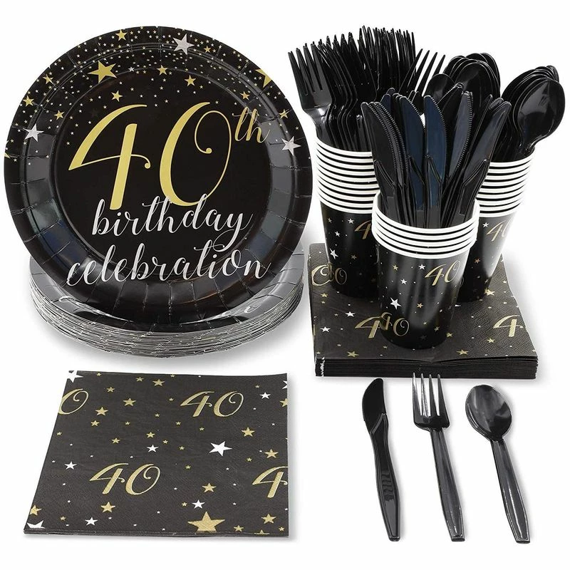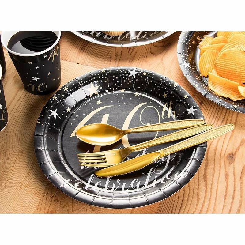 - MILE STONE BIRTHDAY SUPPLIES: Paper plates feature an elegant design with gold scripted 40th Birthday Celebration over a black background with stunning stars; create a perfectly coordinated theme for 40th birthday celebrations and founding anniversaries