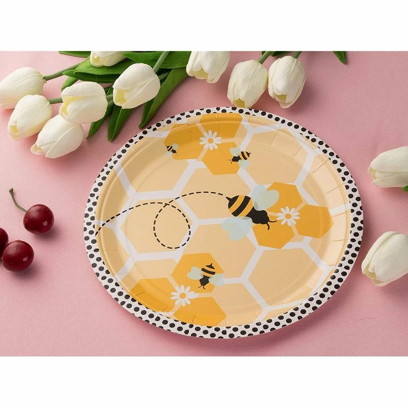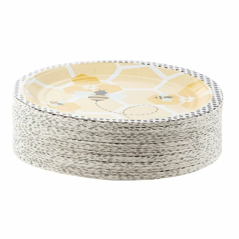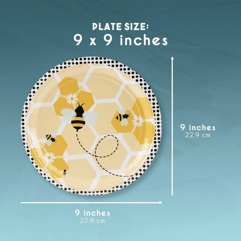 - SERVES 80: Includes enough plates for 80 guests; contains 80 paper plates featuring bees and flowers on a honeycomb shaped design background.