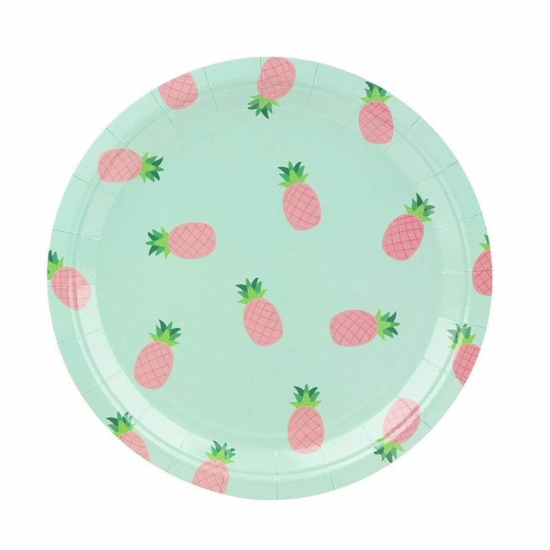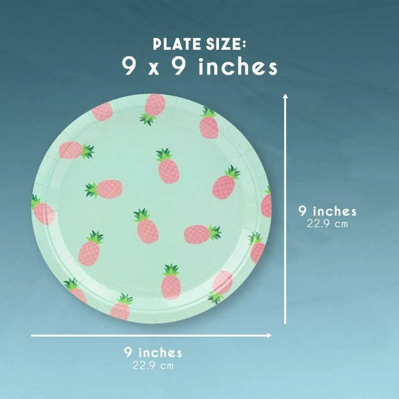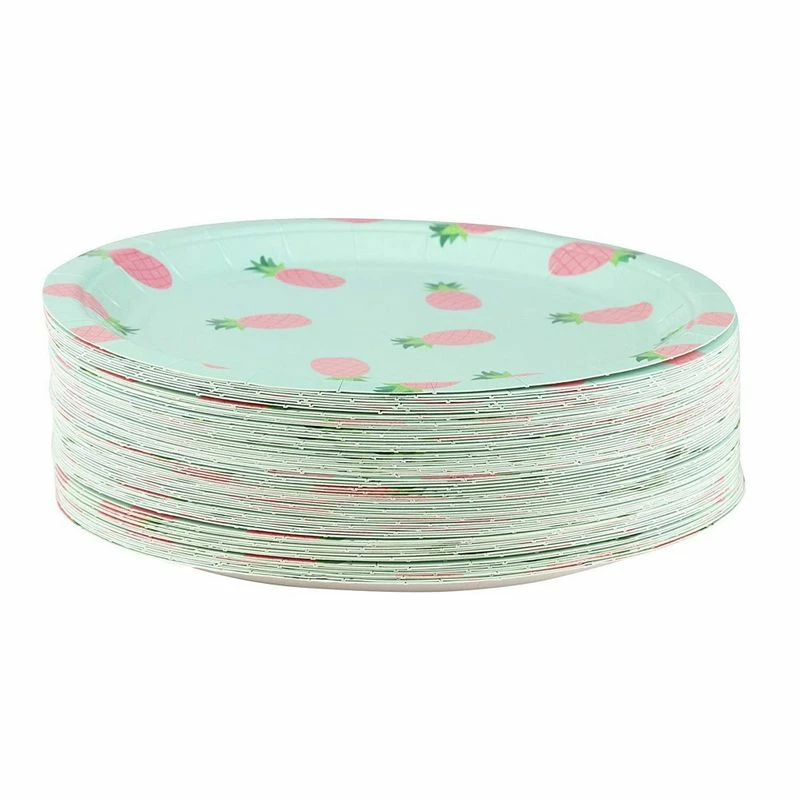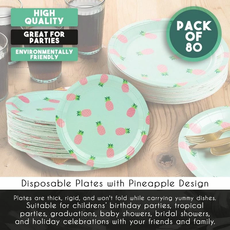 - SERVES 80: Includes enough plates for 80 guests; contains 80 paper plates featuring pink pineapples on a green background.