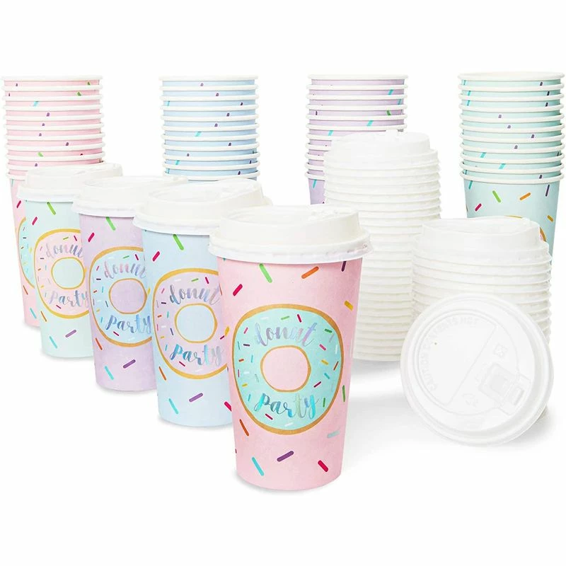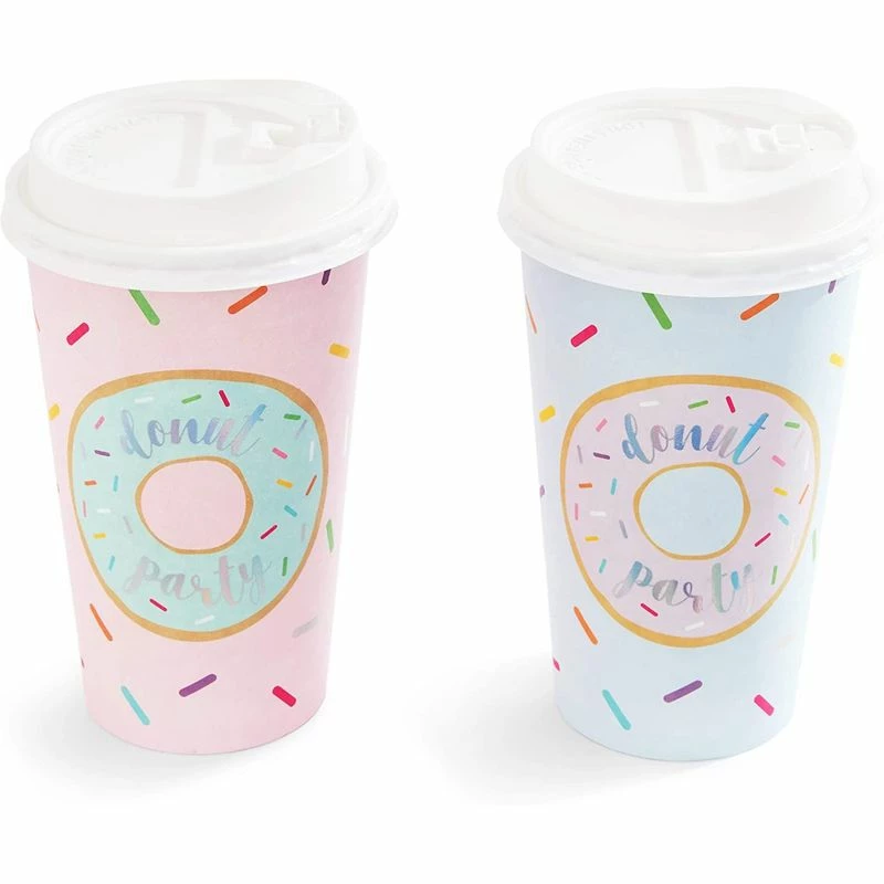 - Coffee Cups: These foil holographic and pastel colored paper coffee cups come designed with a cute donut party design and are great for serving coffee, hot cocoa, and tea
