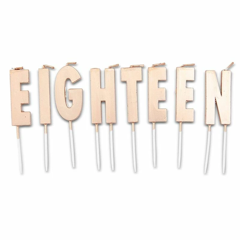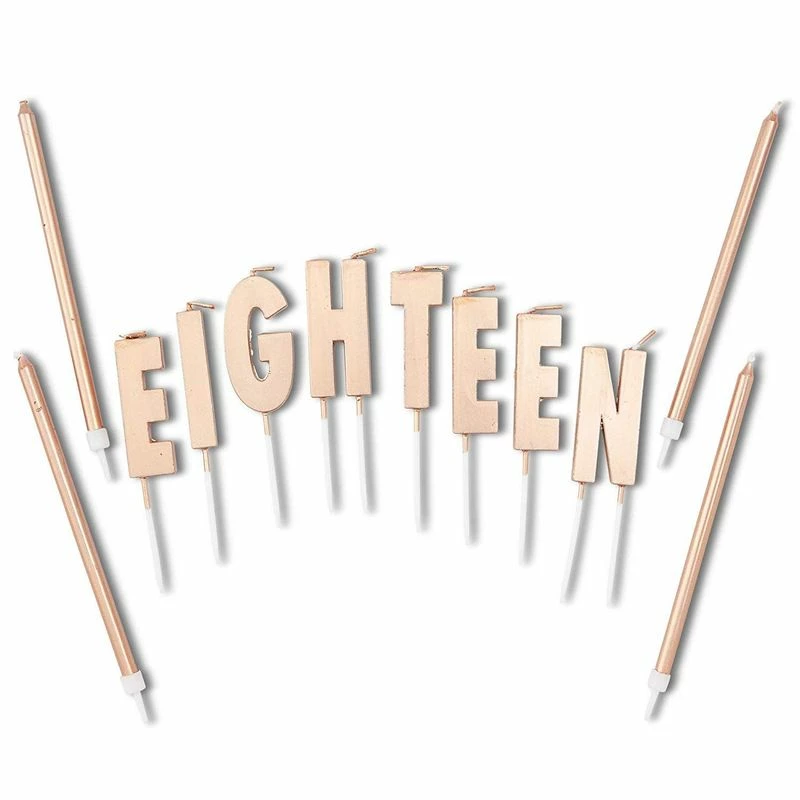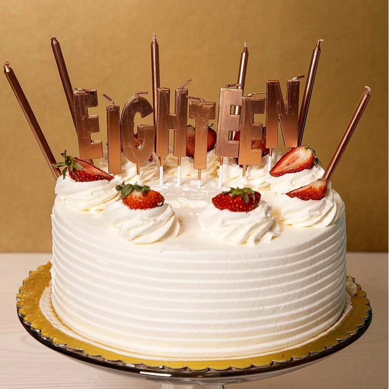 - Give your birthday cake a fun and creative look with these amazing gold metallic “EIGHTEEN” cake candles.
