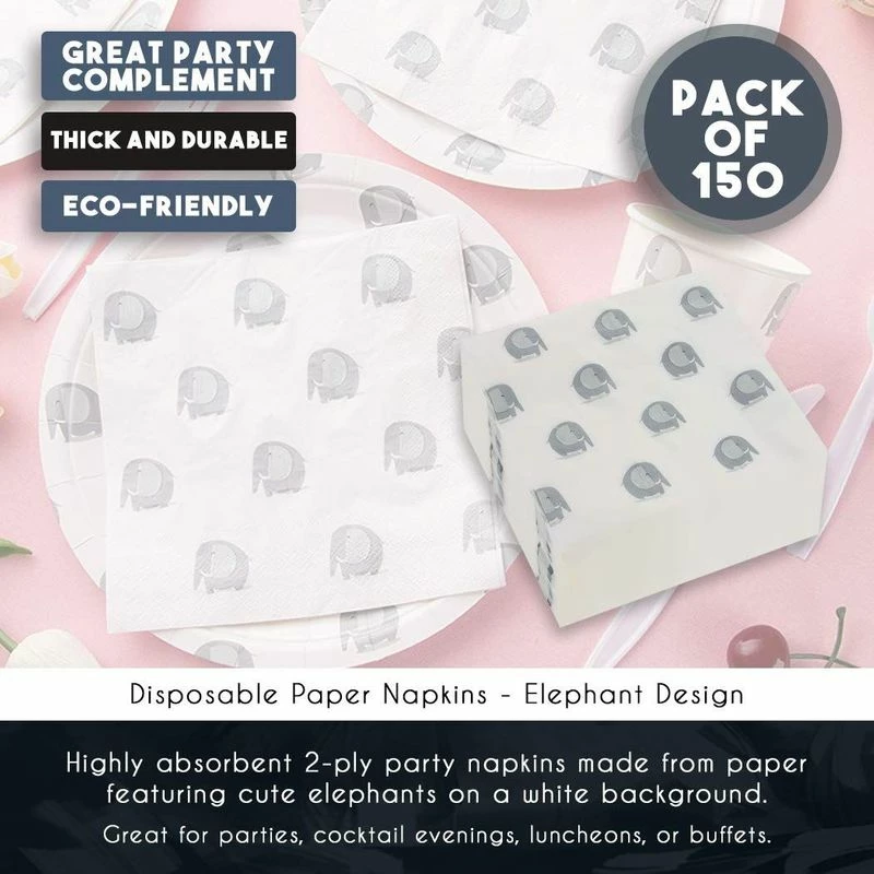 Cocktail Napkins 150 Pack Luncheon Napkins, Disposable Paper Napkins, 2-Ply, Elephant Design, Unfolded 13 x 13 Inches, Folded 6.5 x 6.5 Inches