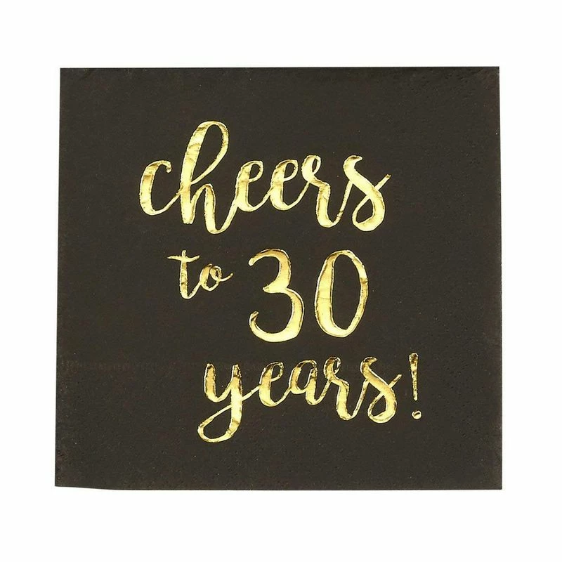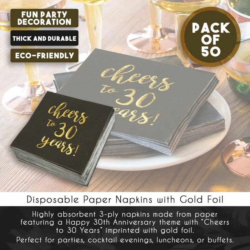 - SET INCLUDES: 50 highly absorbent 3-ply party napkins made from paper featuring a “Cheers to 30 Years” imprint in gold foil