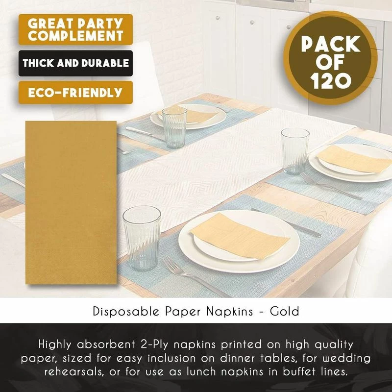 Paper Dinner Napkins 120 Pack Disposable Napkins, 2-Ply Absorbent Napkins, Gold, Unfolded 15.5 x 13 Inches, Folded 7.5 x 4.25 Inches