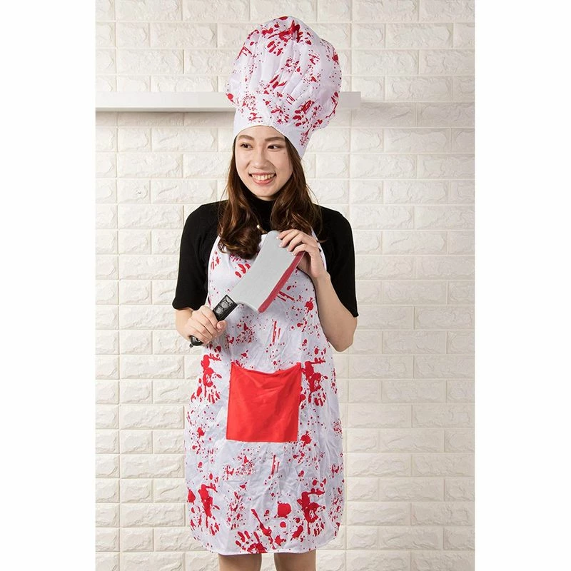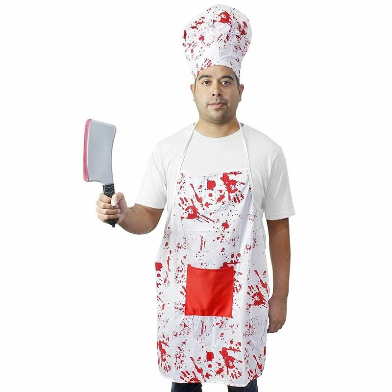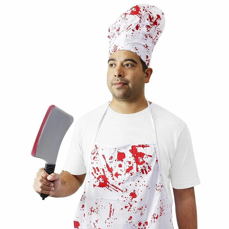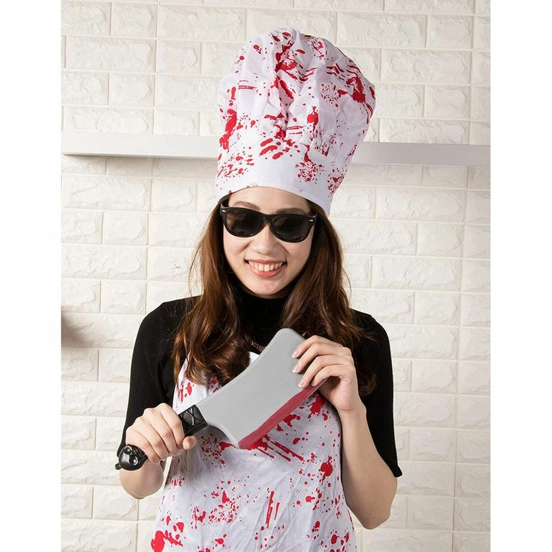 - SET INCLUDES: 1 white apron with red pocket, 1 chef’s hat, and 1 gray cleaver knife with skull and bones handle; designed with blood spatter and bloody handprints, it’s perfect for Halloween, cosplay, costume parties, horror theme events and role plays.