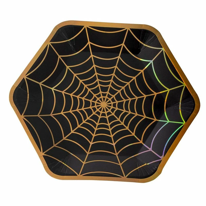 Disposable Plates 50 Count Black Paper Plates, Hexagon Plates, Halloween Party Supplies, with Holographic Spider-Web Design, 9 x 8 Inches