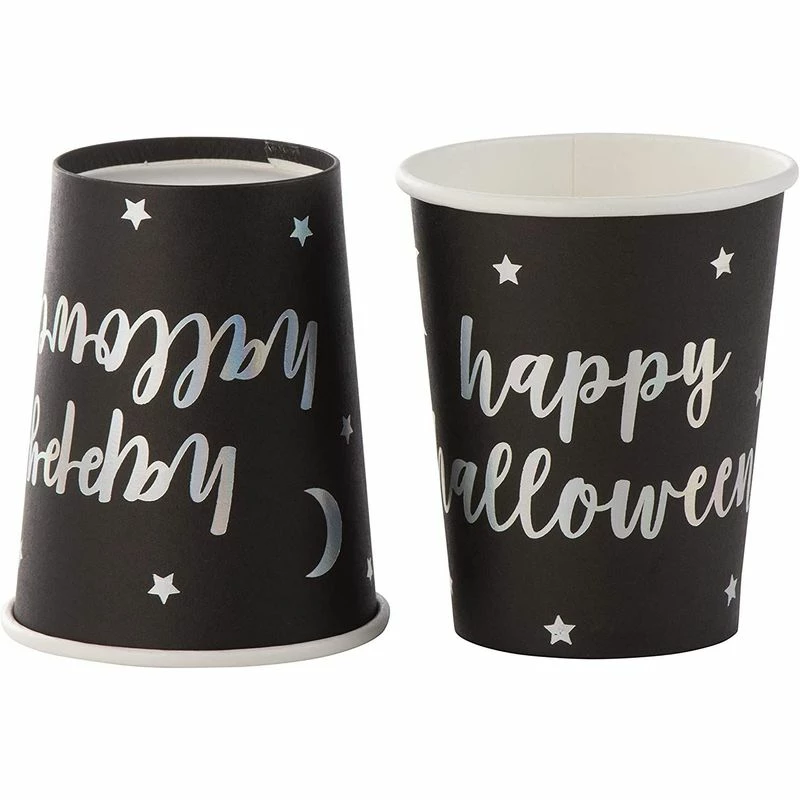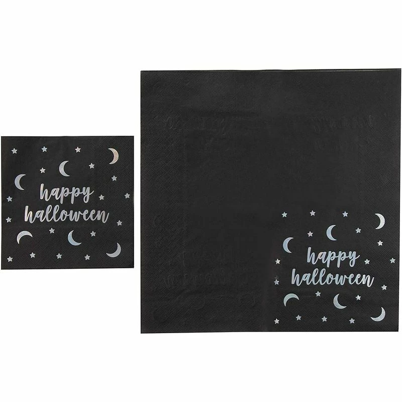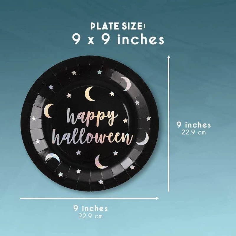 - SOPHISTICATED HALLOWEEN SUPPLIES: Paper plates, cups and napkins feature a tasteful and fun design of crescent moons and Happy Halloween scripted in holographic print against a black background; create a perfectly coordinated theme for dinner parties, October events, children’s birthdays, baby showers, office and classroom parties
