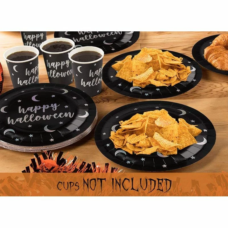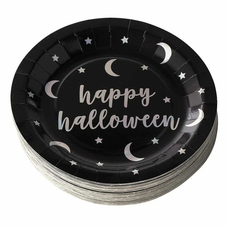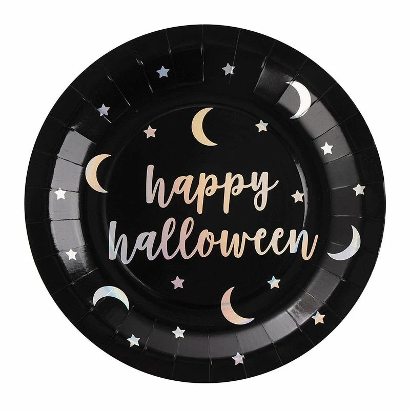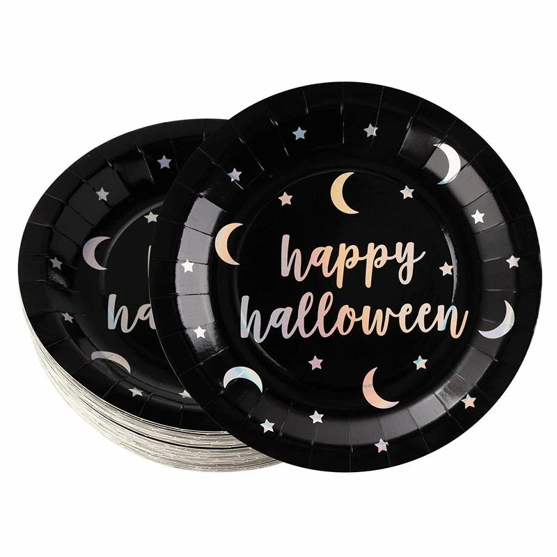 - Happy Halloween: The black paper plates feature holographic moon and star designs; ideal for creating a celebratory atmosphere and perfectly coordinated theme for your Halloween party