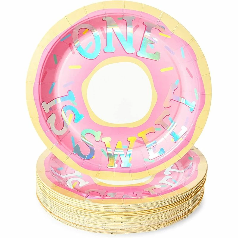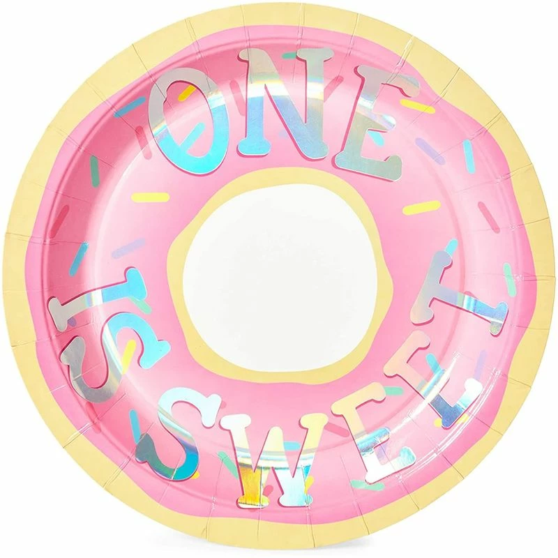 - 1ST BIRTHDAY DECORATIONS: The pink holographic paper plates feature donut sprinkles and say “One Is Sweet”; ideal for creating a celebratory atmosphere and perfectly coordinated theme for your donut theme birthday party