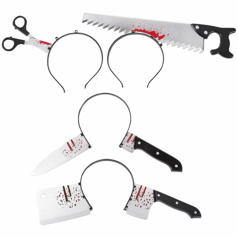 4 Pack Scary Halloween Horror Headbands Realistic Bloody Cleaver, Knife, Scissors, Saw Blade One Size Fits Most