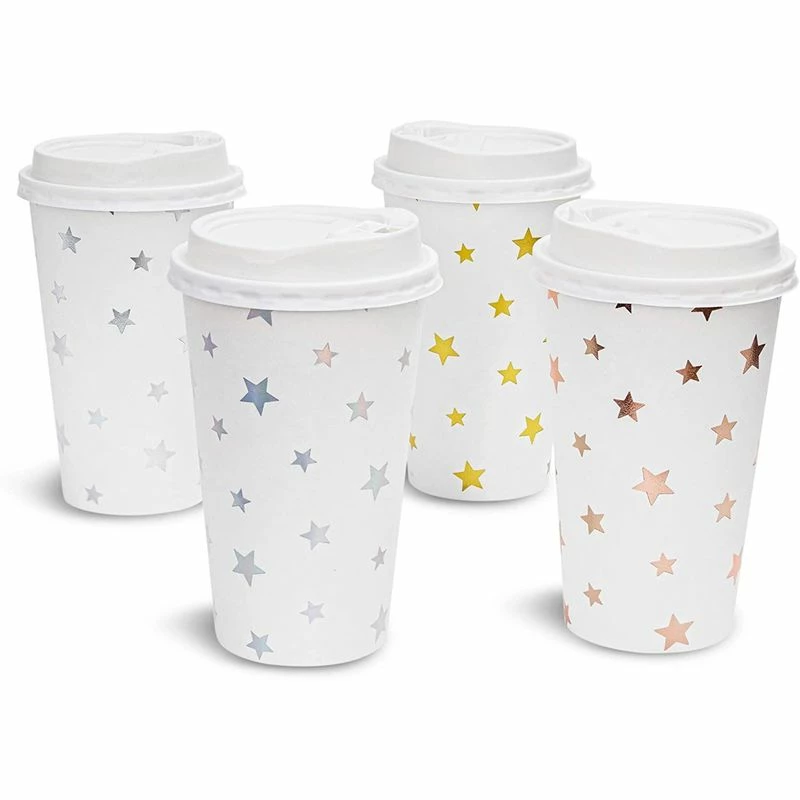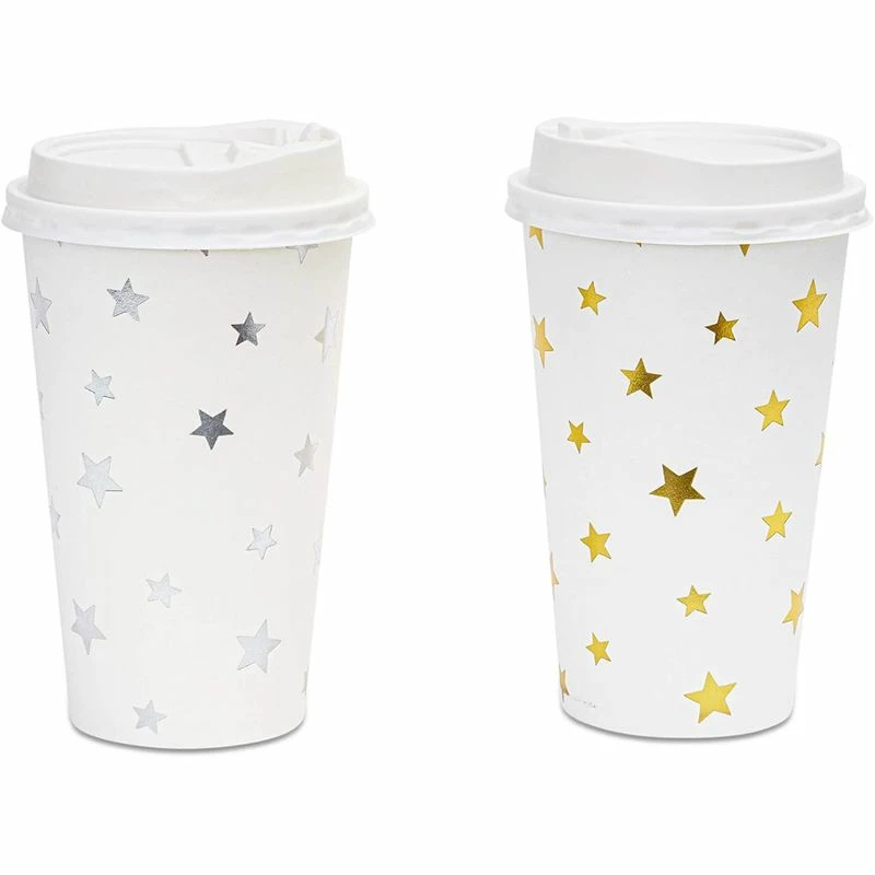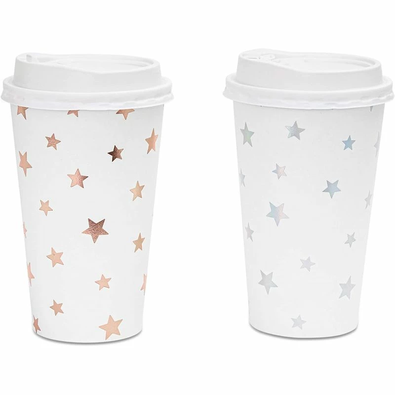- COFFEE CUPS: These to go paper coffee cups come designed with shiny silver, gold, and rose gold foil stars and are great for serving coffee, hot cocoa, and tea