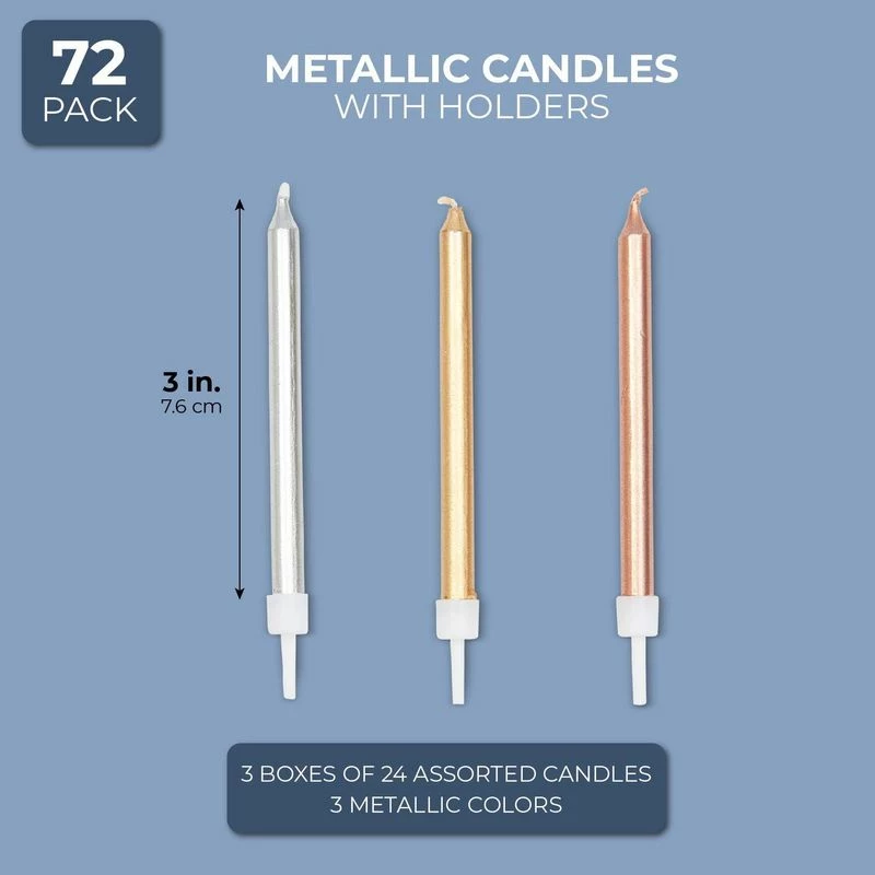 Set includes 3 boxes of candles, 24 of each, 3 colors assorted, 8 of each color, total 72 candles. Candles feature a metallic design that’s ideal for all age Birthday parties, anniversaries, graduations, holiday celebrations, and other special occasions. Place on top of cakes, cupcakes, and other dessert food items to add the finishing touch. Colors: Metallic gold, rose gold, and silver. Non-toxic and safe to use. 3 Inches in length