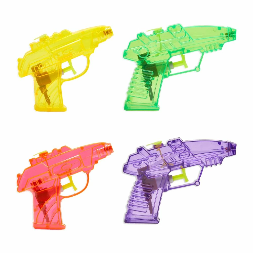 - Mini Water Guns Bulk: This set contains 24 mini water guns; 6 of each bright neon color in yellow, pink, purple, and green