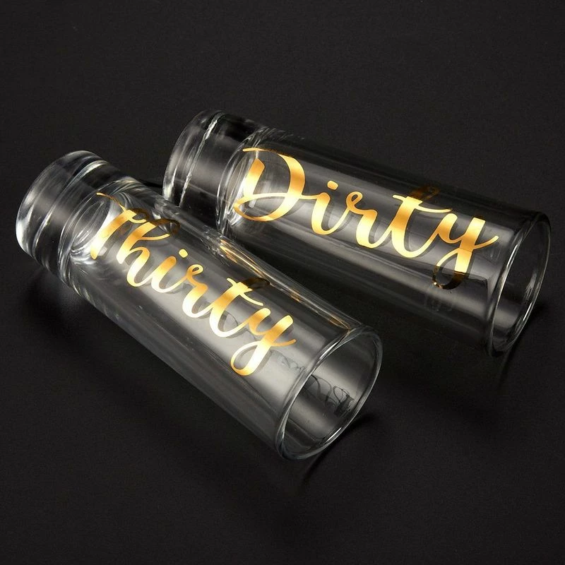 - TIME TO CELEBRATE: A pair of happy birthday shot glasses sure to make anyone enjoy the celebration. One glass has Dirty and another has Thirty gold print. The gold cursive writing letters on clear glass are classy and elegant.