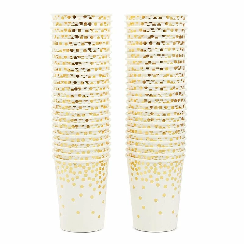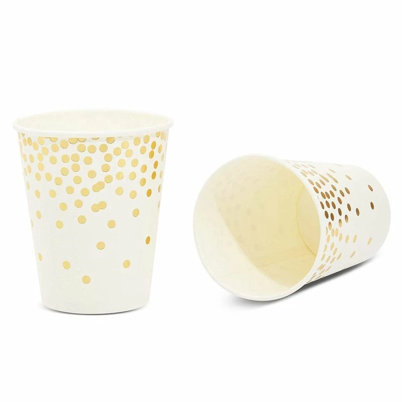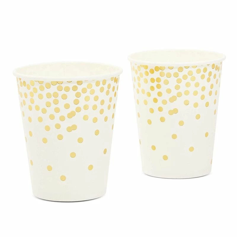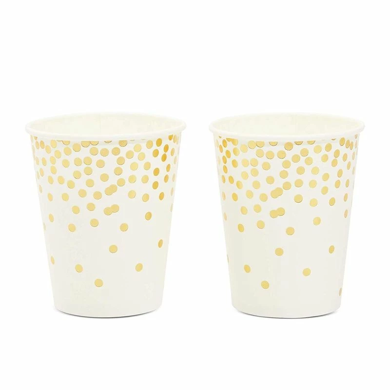 Get a set of beautiful party paper cups with gold foil polka dot confetti and decorate your tables with elegance. These disposable paper cups are perfect for any event like a wedding, bridal shower, birthday, housewarming, etc. These party cups are made with sturdy and quality material. You can use them to serve different drinks like soda, juice, lemon tea, and more.
