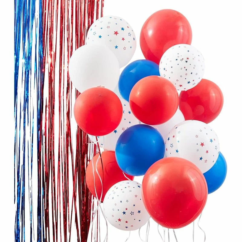 - Latex Balloons: Don’t make decorating harder than it should be; impress your guests with these fun and cheerful red, white, and blue patriotic party balloons