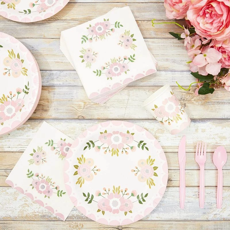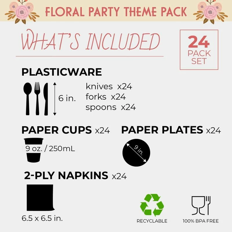 Disposable Dinnerware Set Serves 24 Vintage Floral Party Supplies, Includes Plastic Knives, Spoons, Forks, Paper Plates, Napkins, Cups