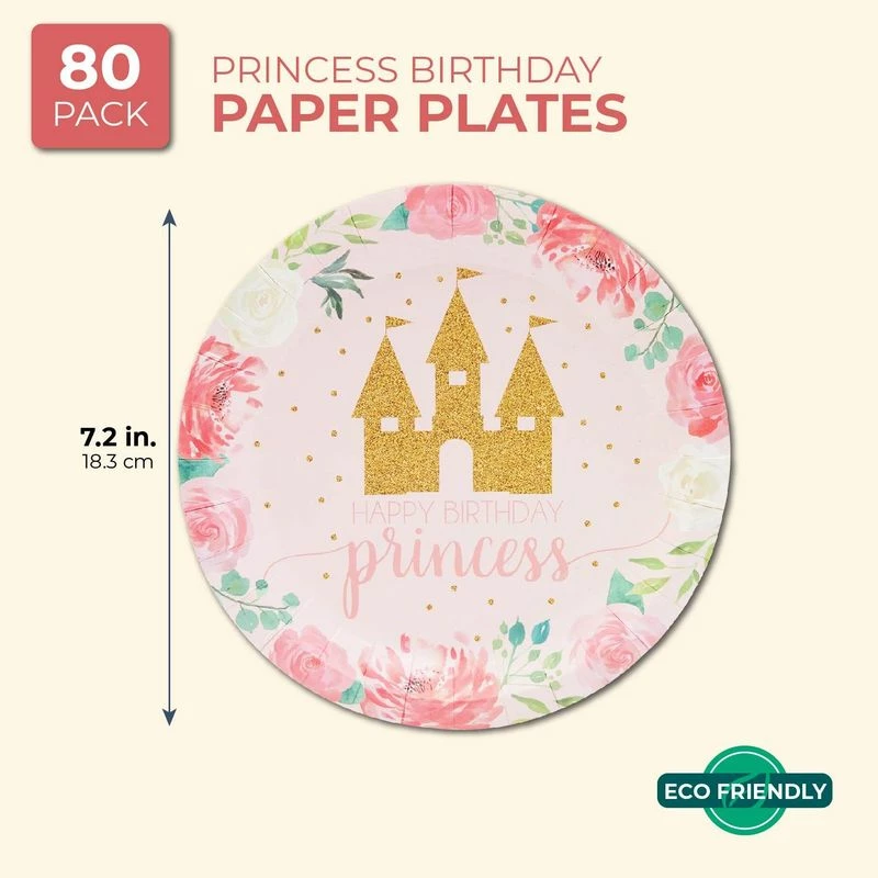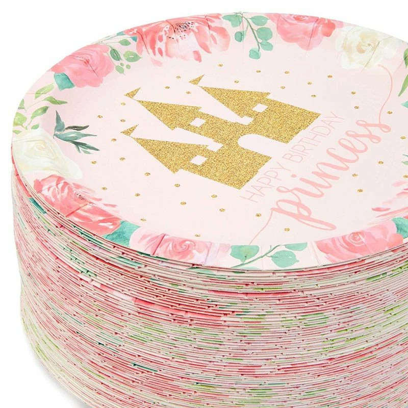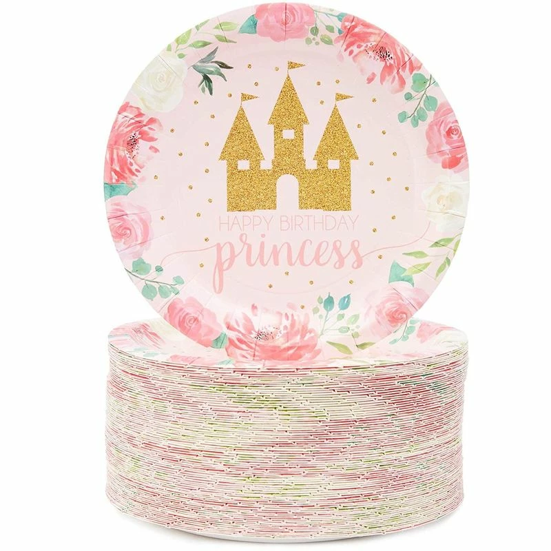 - PRINCESS BIRTHDAY PARTY DECORATIONS: Create celebratory atmosphere and perfectly coordinated theme for your princess theme party, dinner plates feature pink flower border with a gold castle in the middle