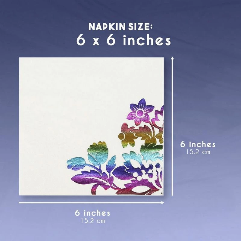 Add these versatile beverage napkins to your rainbow party supplies for an upcoming graduation party, kids birthday party, baby shower, anniversary, or family gathering. The decorative floral rainbow foil design will provide a cohesive theme throughout your event.