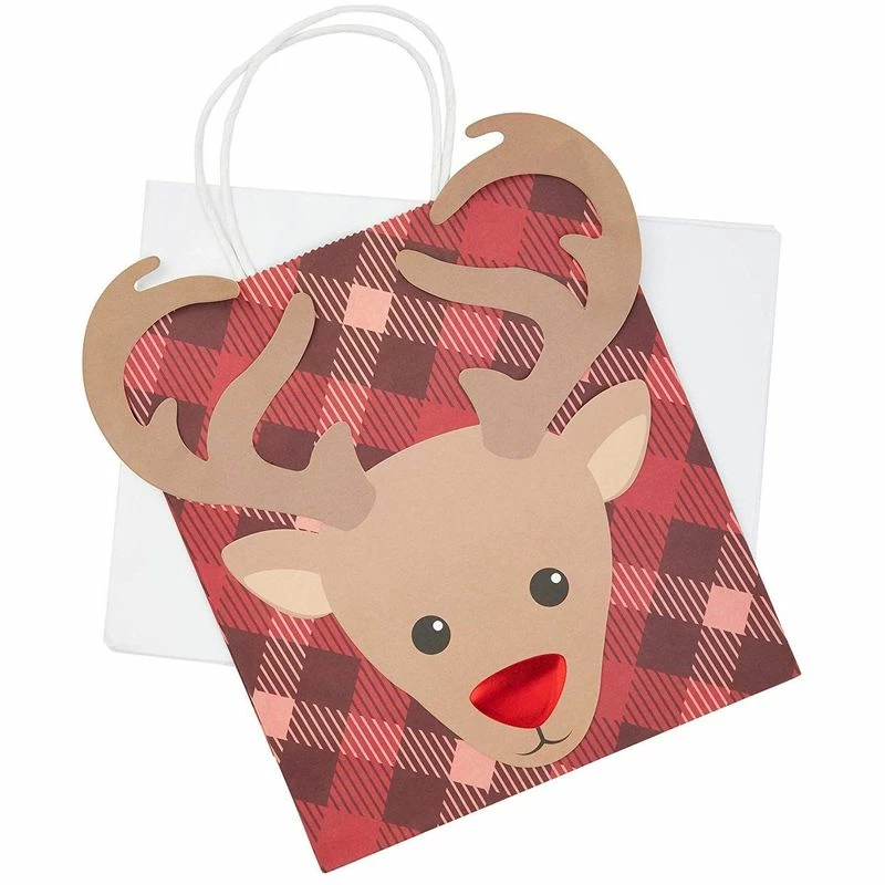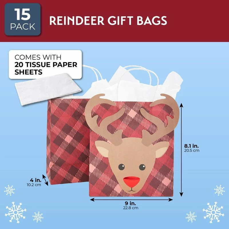 This festive holiday wrapping set includes 15 Christmas reindeer themed gift bags with handles and 20 pieces of white tissue paper. Die-cut design with brown Reindeer, red foil nose and red plaid background. Ideal for wrapping gifts to friends and family; Great for holding party favors, clothing, candles, and other small to medium sized items. Dimensions: (Excludes the handles) 9 x 8.1 x 4 Inches