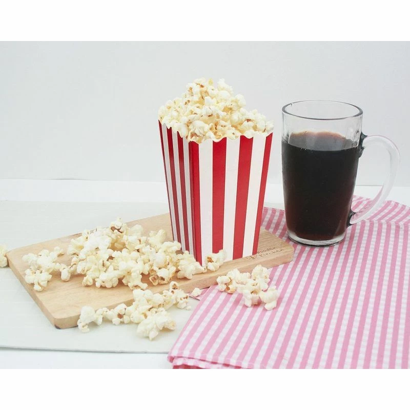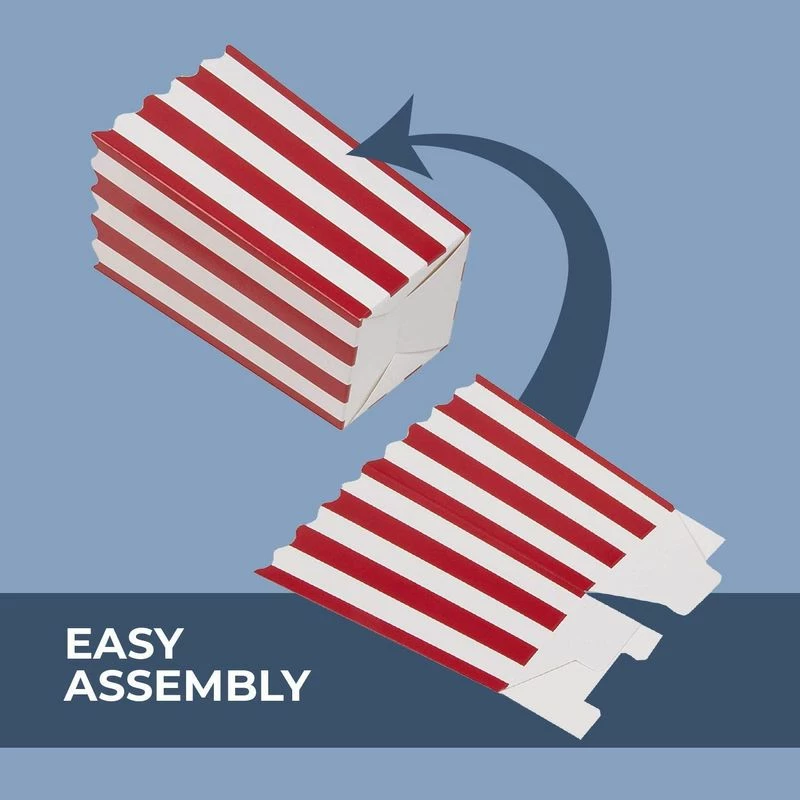 Made of durable 230gsm paper, these 20oz popcorn containers feature scalloped edges in the classic movie theater design. Just the thing for your upcoming movie night, first date, birthday party, or the next time you and your buddies are going to binge-watch the next TV-series. Open top access provides easy access to your salty or sweet popcorn. Use these popcorn containers and share with your buddies on movie night or get-togethers! To pop-up each box, simply push inside the container and pop the bottom of the box out, so the box is opened up. Dimensions: When Fully Assembled: 3.3 x 5.6 x 3.3 Inches