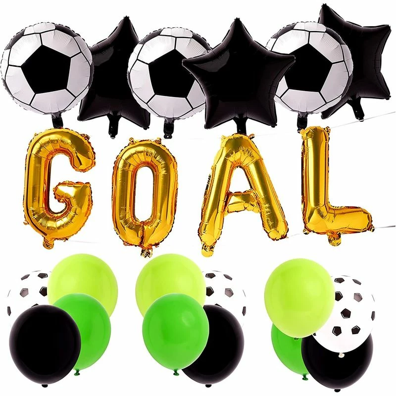 - WHAT’S INCLUDED: Includes 46 balloons: 16 printing balloons, 6 green balloons, 6 light green balloons, 6 black balloons, 4 white and black balloons, 2 soccer balloons, 2 stars balloons and 4 letter balloons that spell “GOAL”