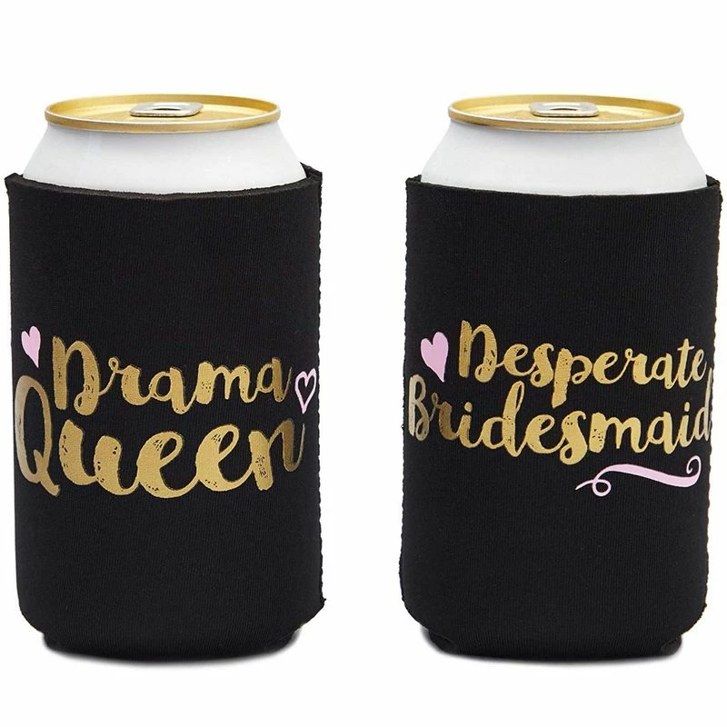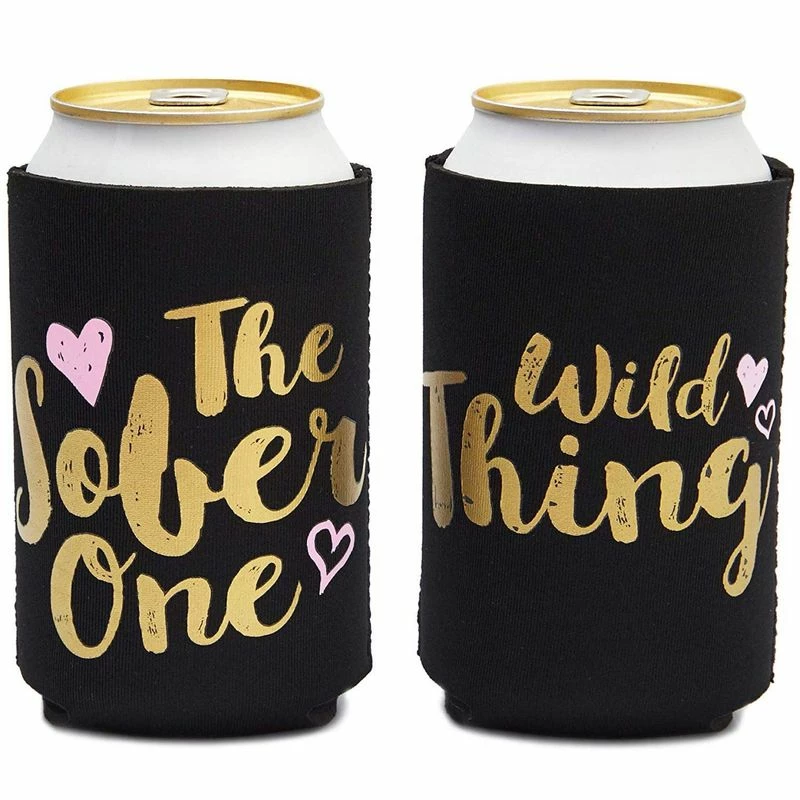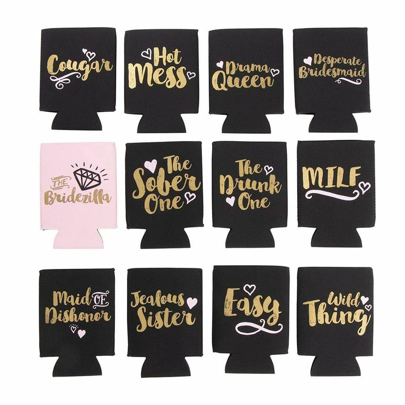 - Bachelorette Party Supplies: These can cooler sleeves include 12 different designs that are ideal for a bachelorette celebration with friends; designs included in this pack are black with gold foil and pink text