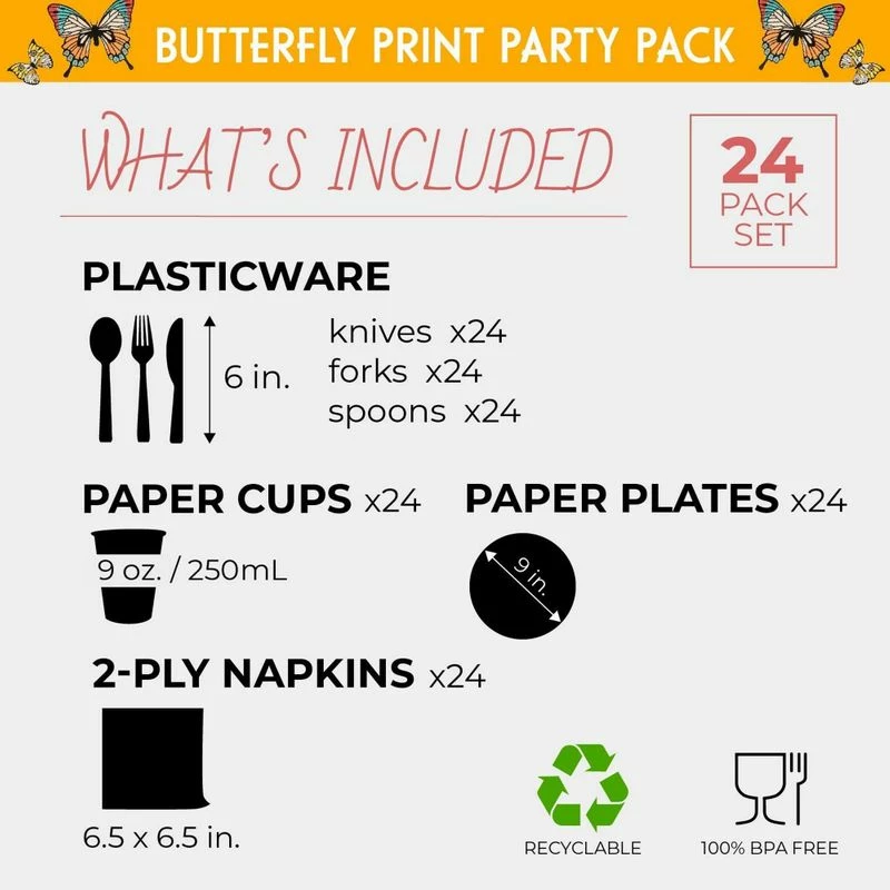 - TIME TO SERVE A PARTY: Includes enough tableware for 24 guests; contains 24 of each of the following: Plastic Forks, Spoons and Knives, also Paper Plates, Napkins and Cups.