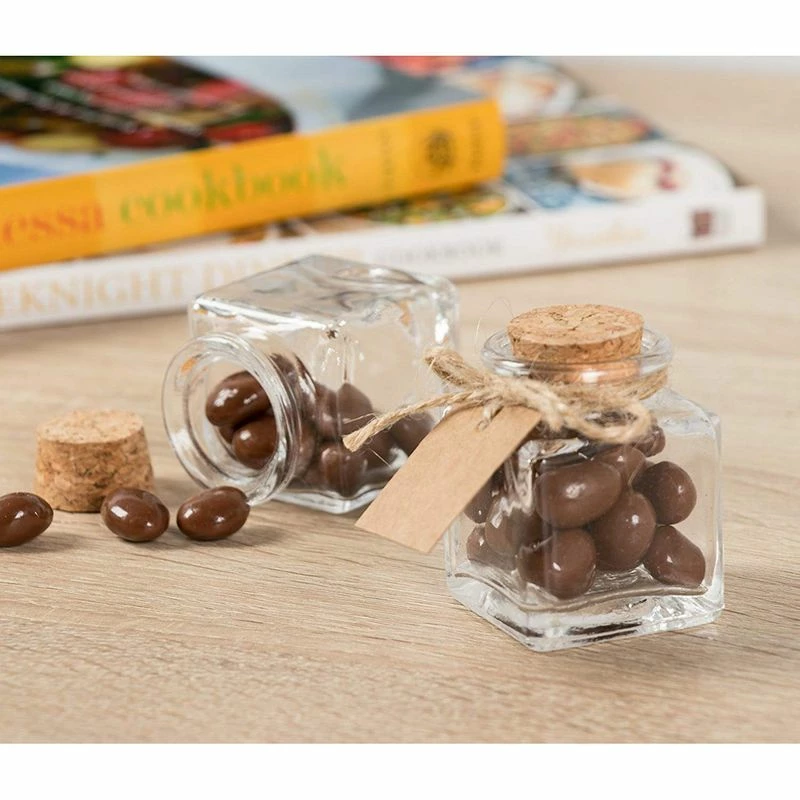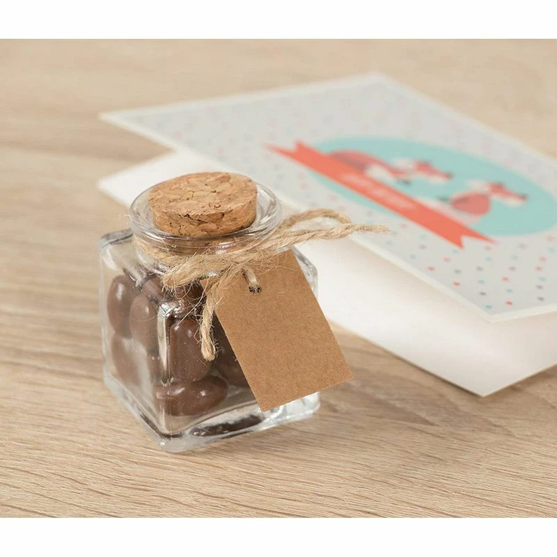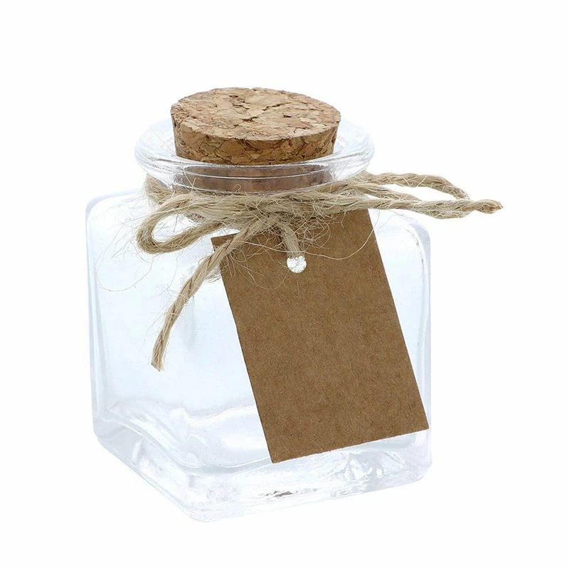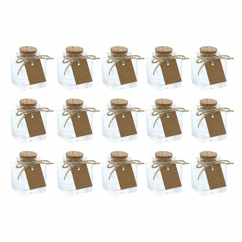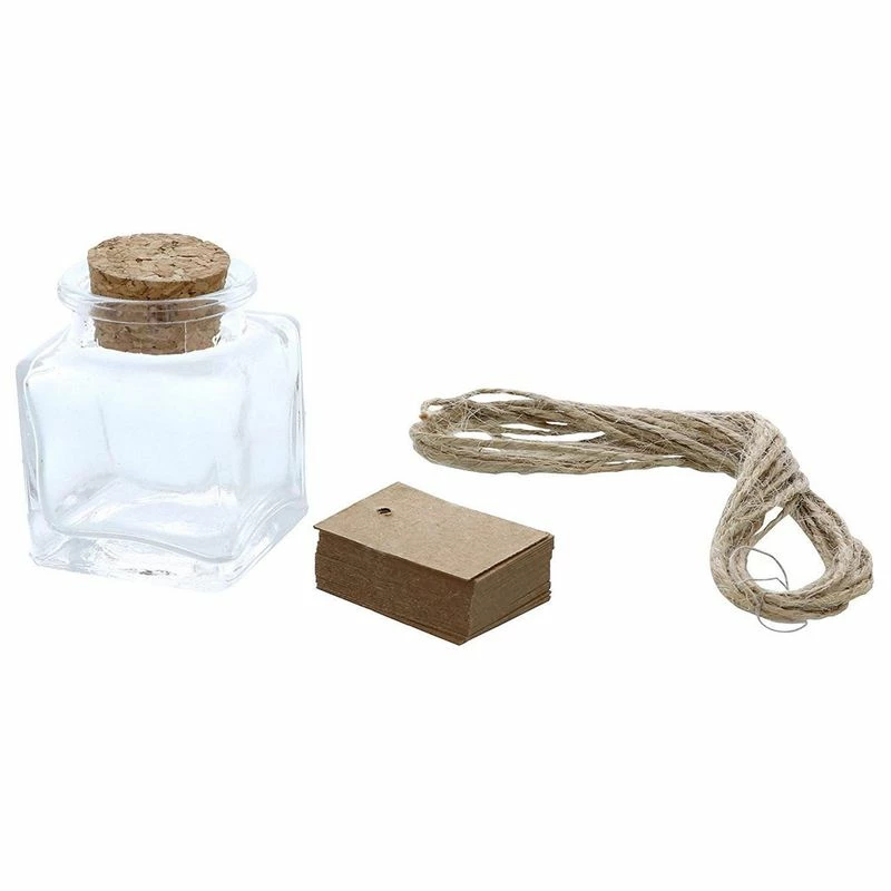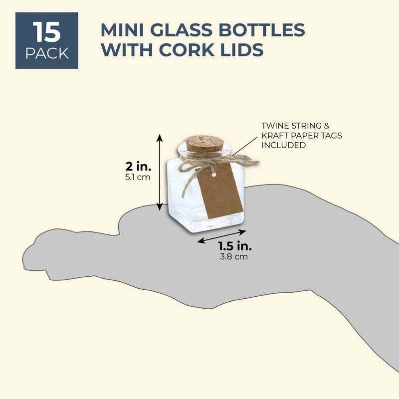- CORKED VIALS: The package comes with 15 decorative transparent glass square shaped bottles. Each bottle has a cork for closure. This set comes with a jute rope and 25 mini kraft paper tags.