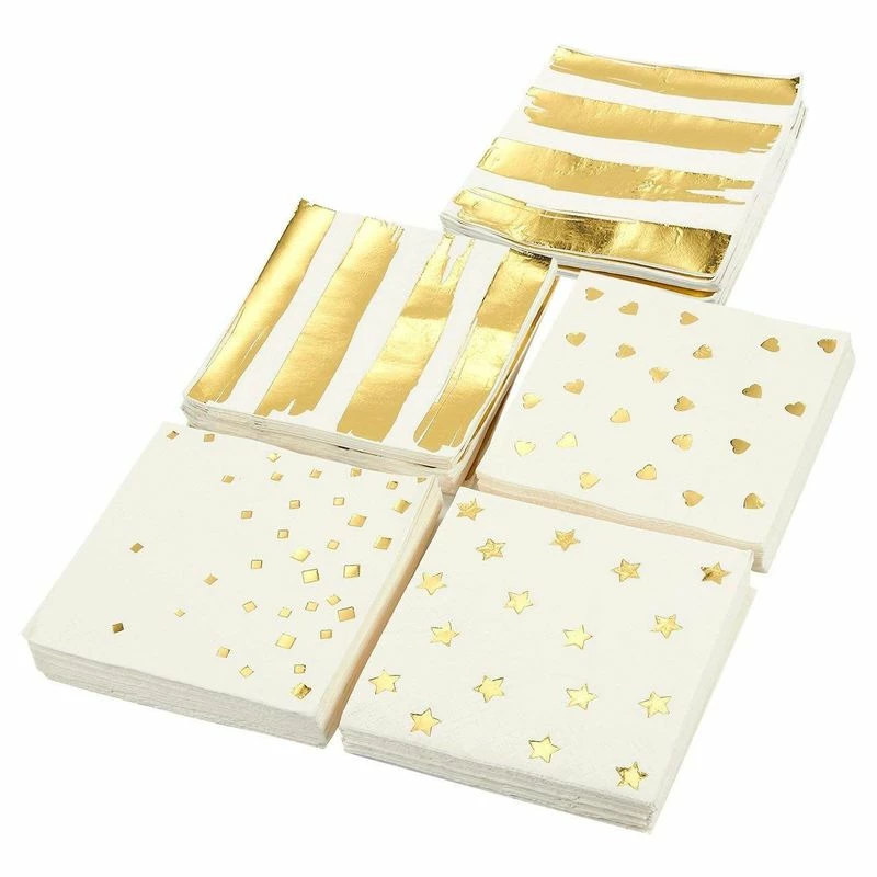 - SET INCLUDES: 100 pack assorted cocktail napkins with elegant and modern gold foil designs. Measures 10 x 10 inches unfolded; 5 x 5 inches folded.